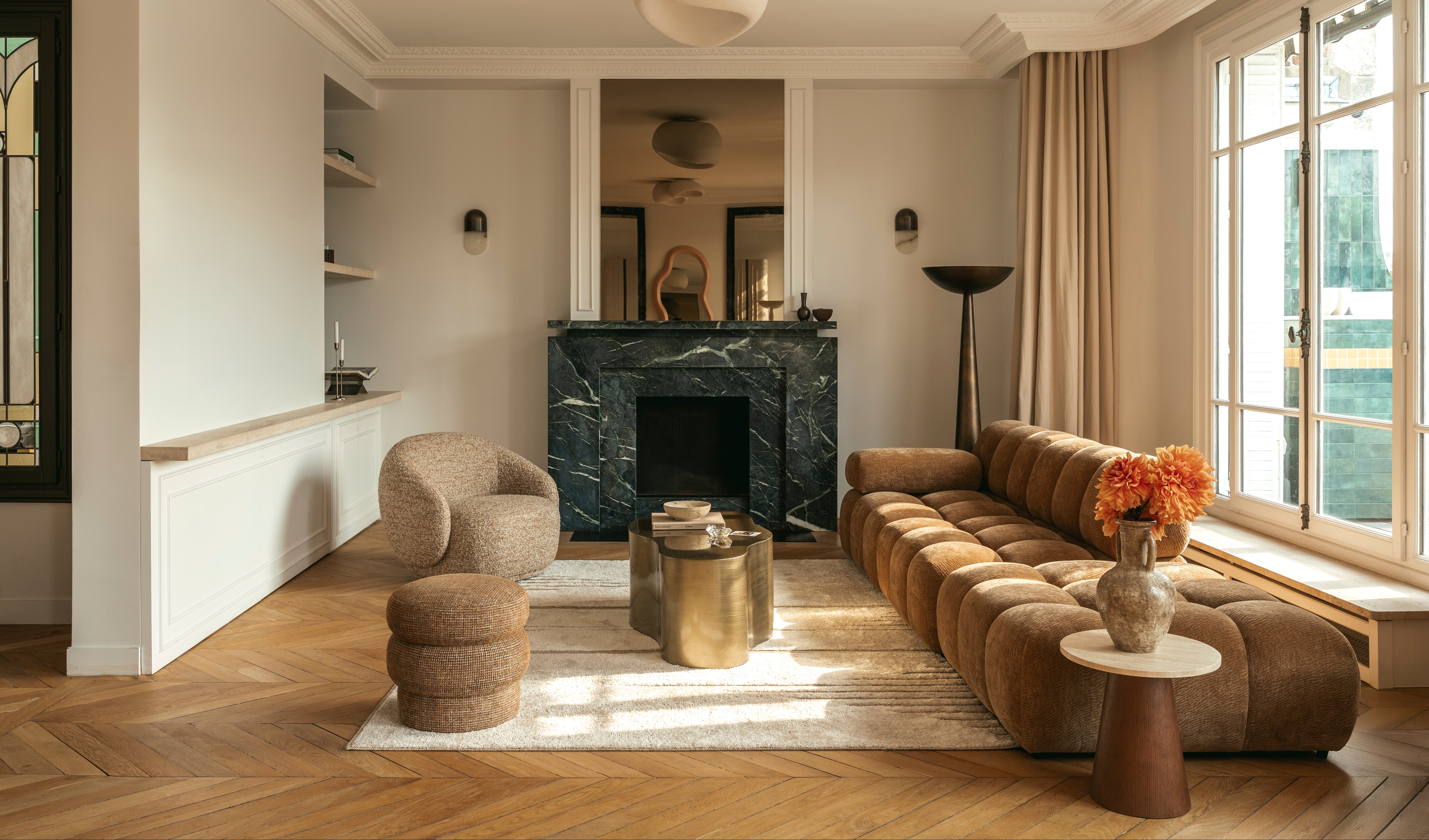Pour cette sélection NV GALLERY, j’ai voulu créer un intérieur minimaliste à la fois chic et cosy dans lequel on se sent bien. Comme dans la mode, j’aime particulièrement les tons sobres beige, blanc, marron, noir et les beaux matériaux (travertin, bois…). L’ensemble me correspond totalement.