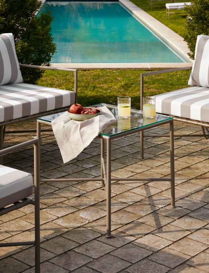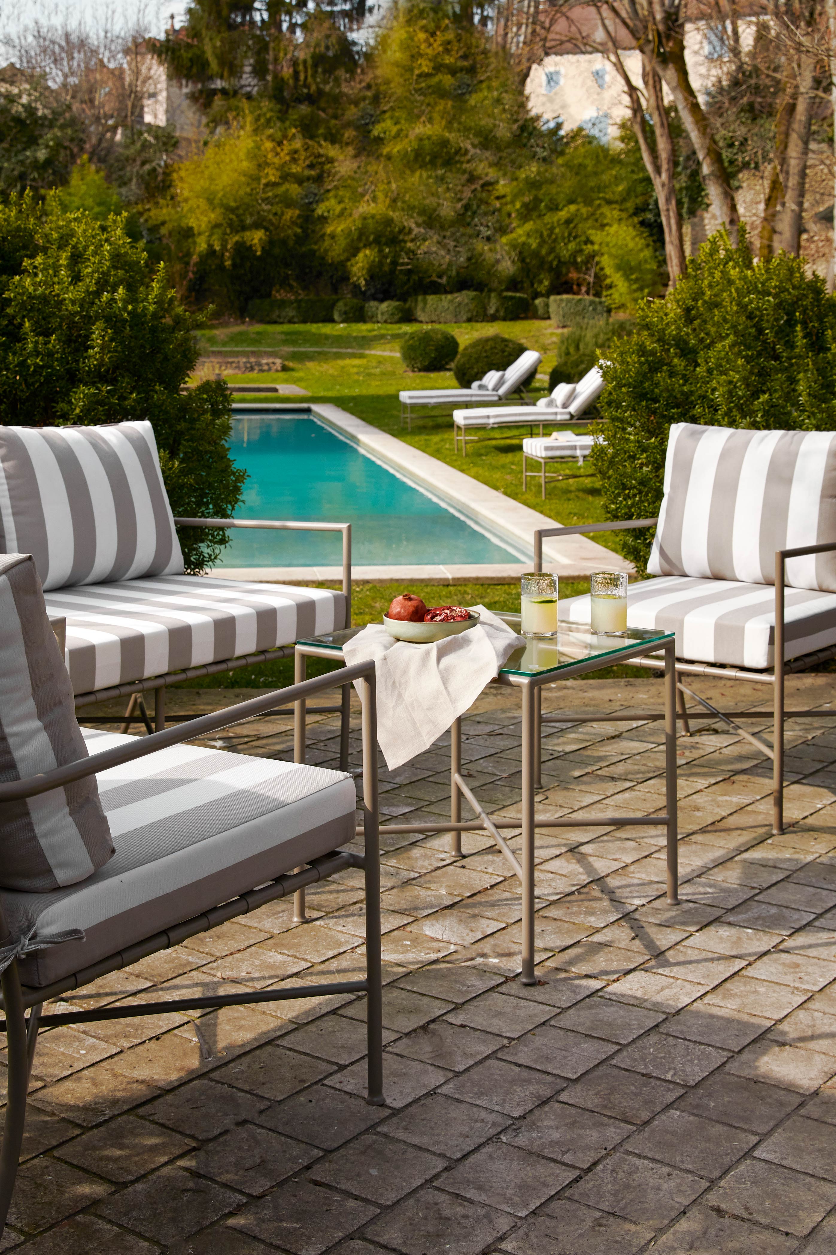 Das 2er-Set Tische BEL AIR aus taupefarbenem Metall kombiniert eine filigrane Struktur mit einer Tischplatte aus gehärtetem Glas und sorgt so für einen sommerlich eleganten und flexiblen Außenbereich.