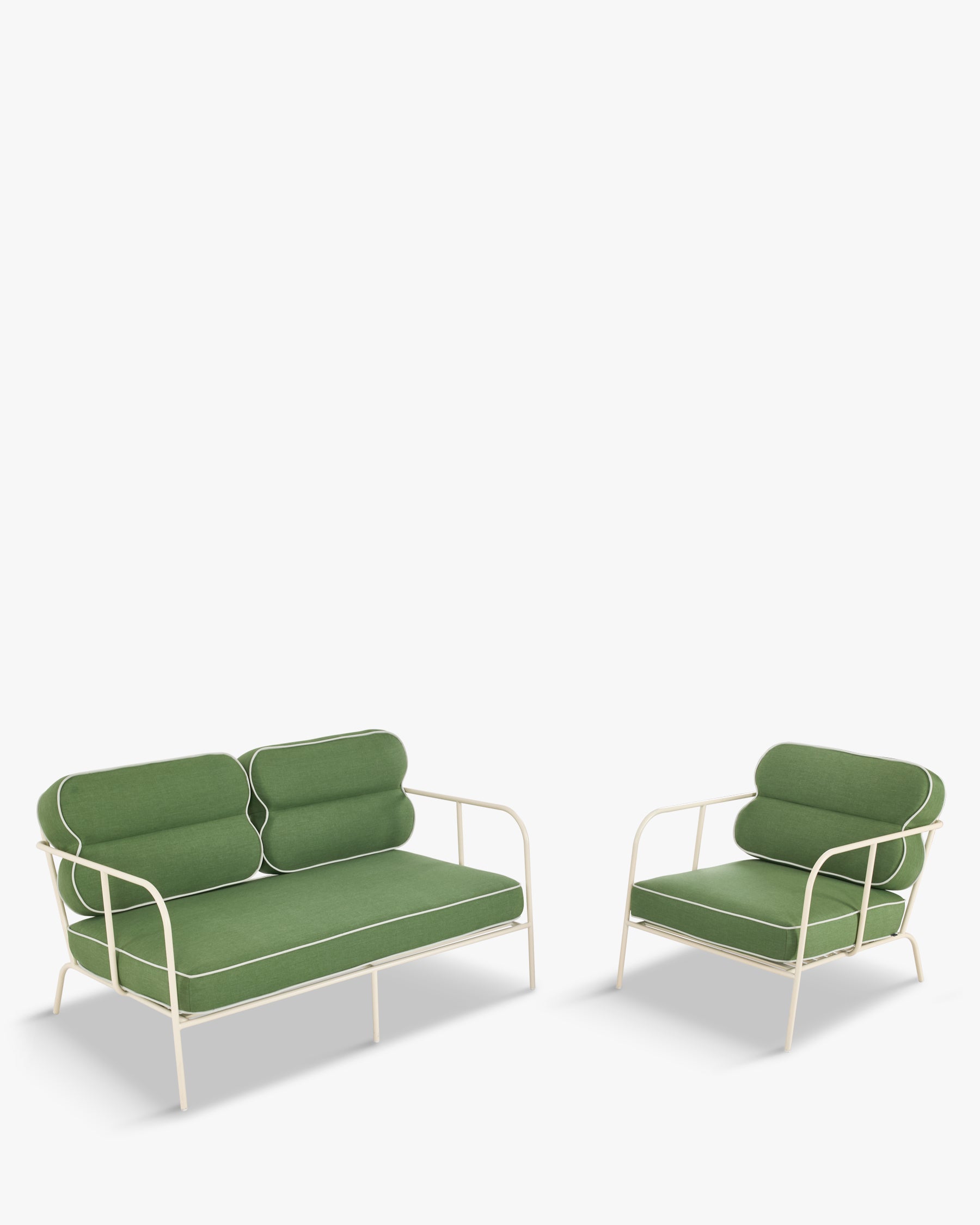 Das Gartenlounge-Set MADDALENA, bestehend aus einem 2-Sitzer-Gartensofa und einem Gartensessel, verkörpert eine klare modernistische Ästhetik mit einer grafischen Rohrstruktur aus für den Außenbereich behandeltem Eisen, veredelt durch eine Ausführung in mandelbeigem Farbton. Die großzügig gepolsterten Sitz- und Rückenkissen, akzentuiert durch eine kontrastierende Paspel, sorgen für Komfort und Weichheit. Abnehmbar und dezent an der Struktur befestigt, sind sie mit einem wasserabweisenden Stoff bezogen und garantieren so eine langlebige Eleganz im Außenbereich.