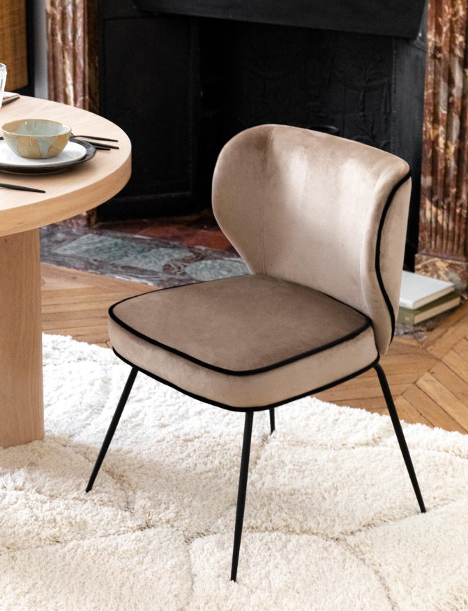 Unsere Rückgabebedingungen lesenWir lieben diesen supertrendigen Samt- oder Stoffstuhl, der Samt und schwarzes Metall perfekt miteinander verbindet.