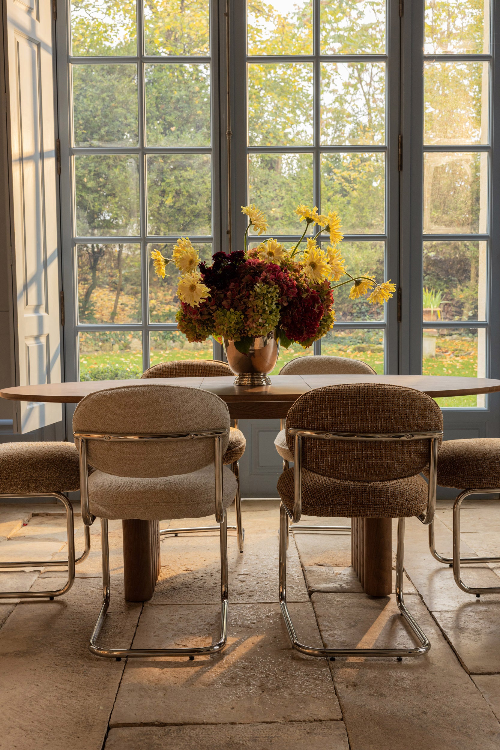 Stuhl, Bouclé Stoff in Beige Macchiato & verchromtes Metall