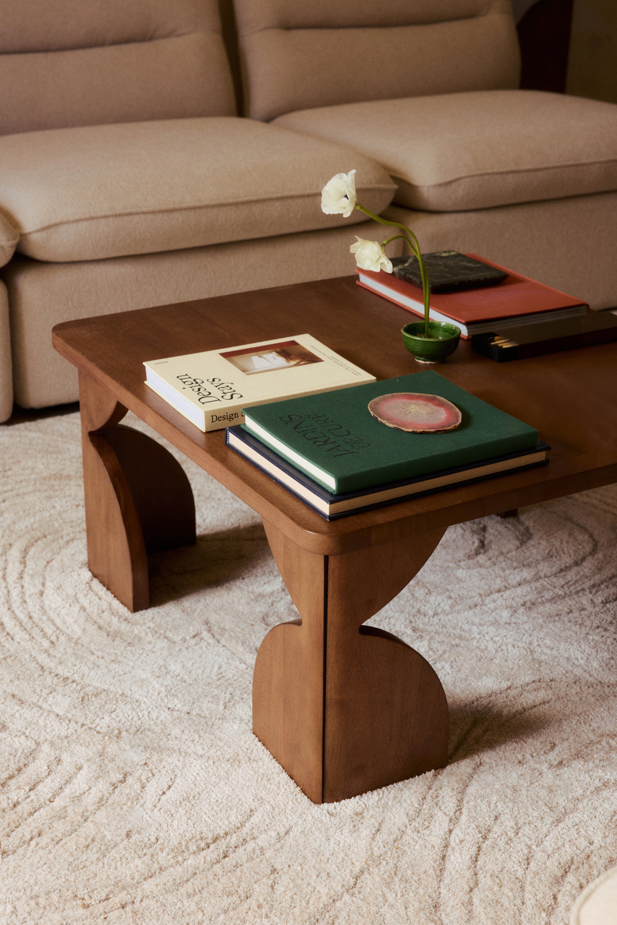 KAYLA als Couchtisch greift die vom Brutalismus und den 70er-Jahren inspirierten Linien auf und wird so zu einem markanten Möbelstück, das dem Wohnzimmer visuelle Struktur verleiht.