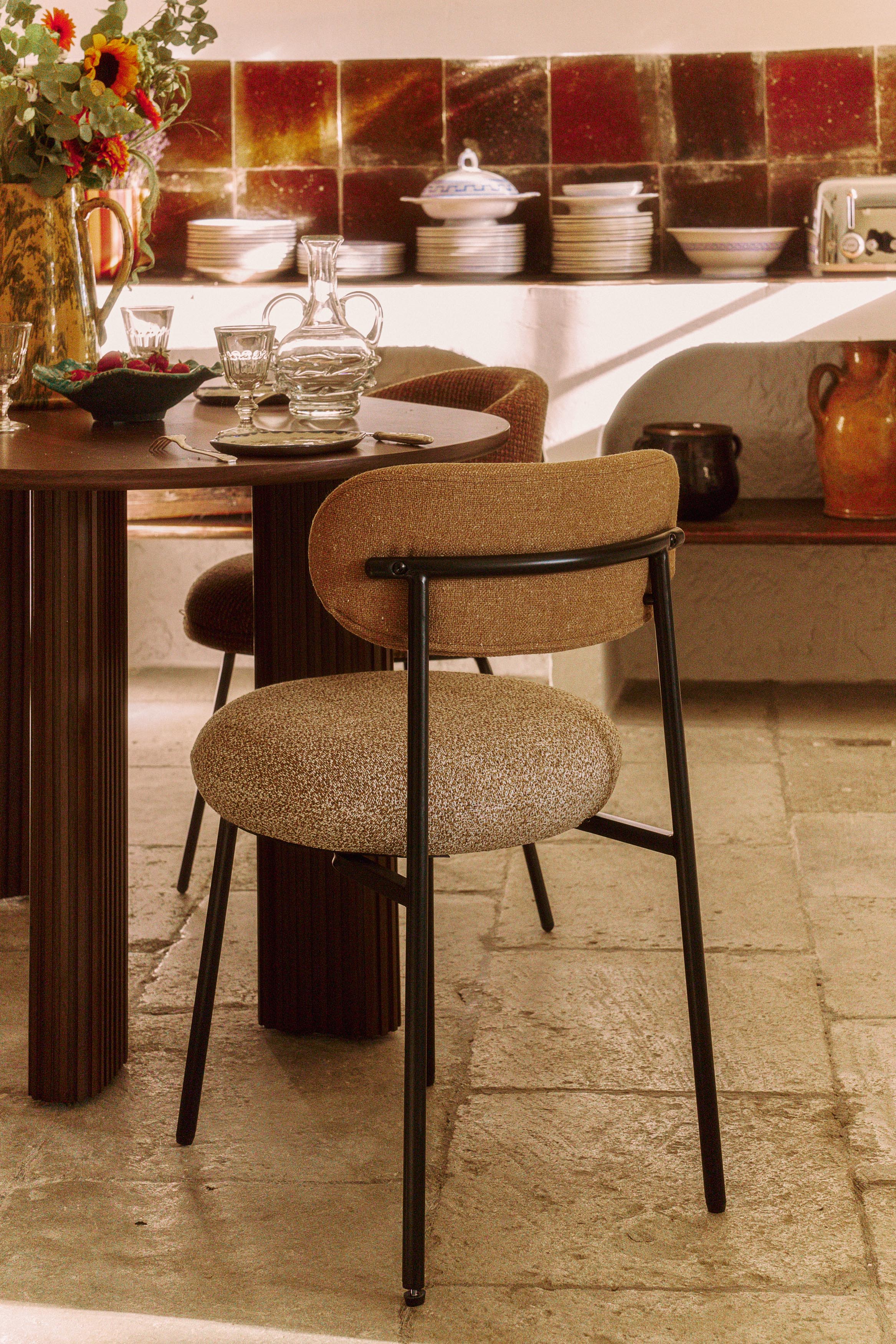 Polsterstuhl, Kamel-Sand, Gelb-Meliert & schwarzes Metall