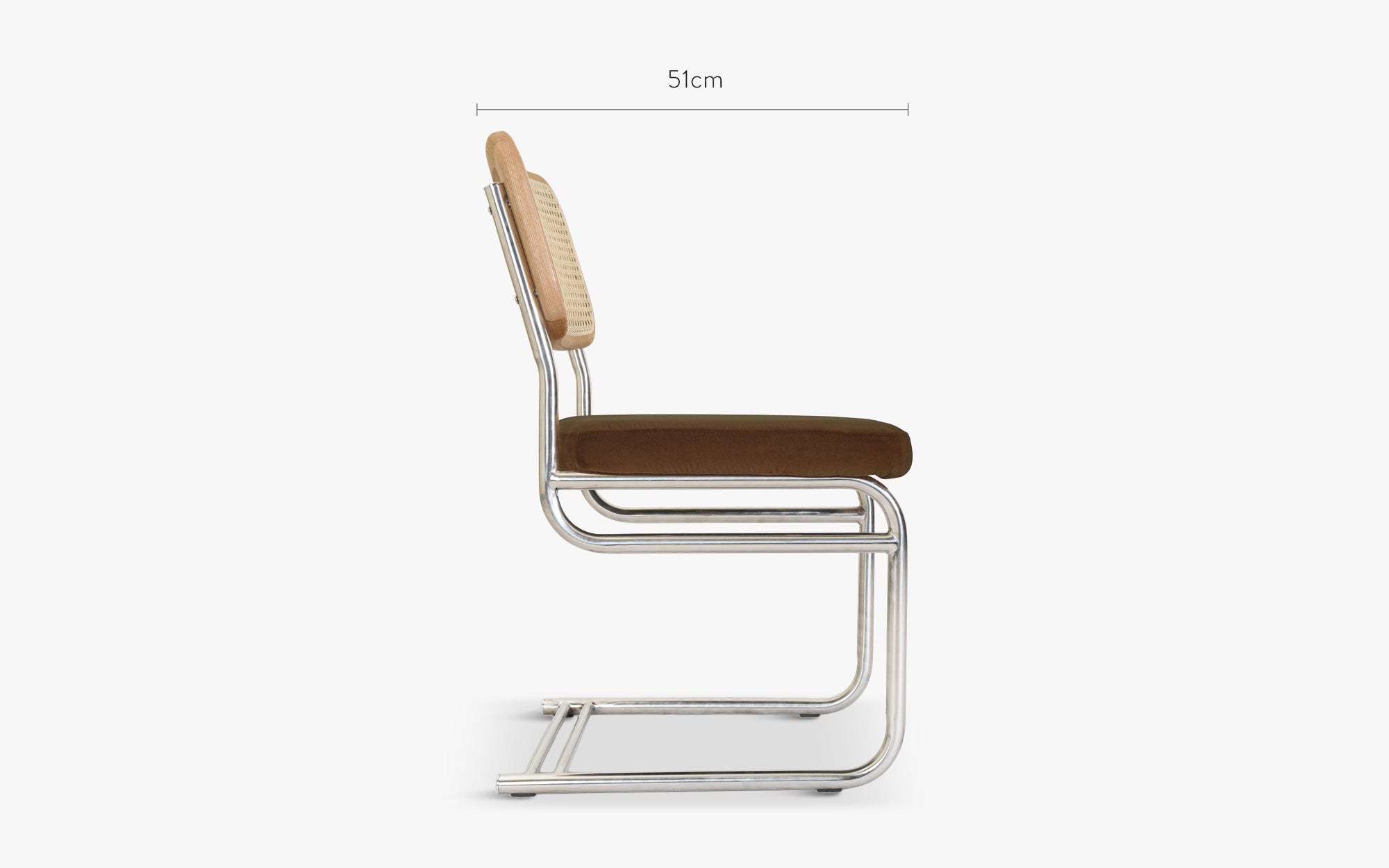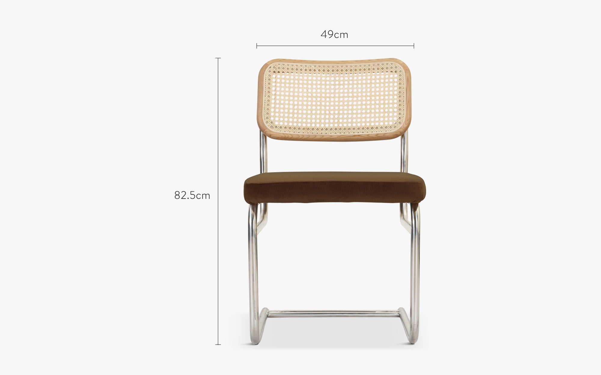 Design Stuhl, Samt in Karamell, Rattan & verchromtes Metall