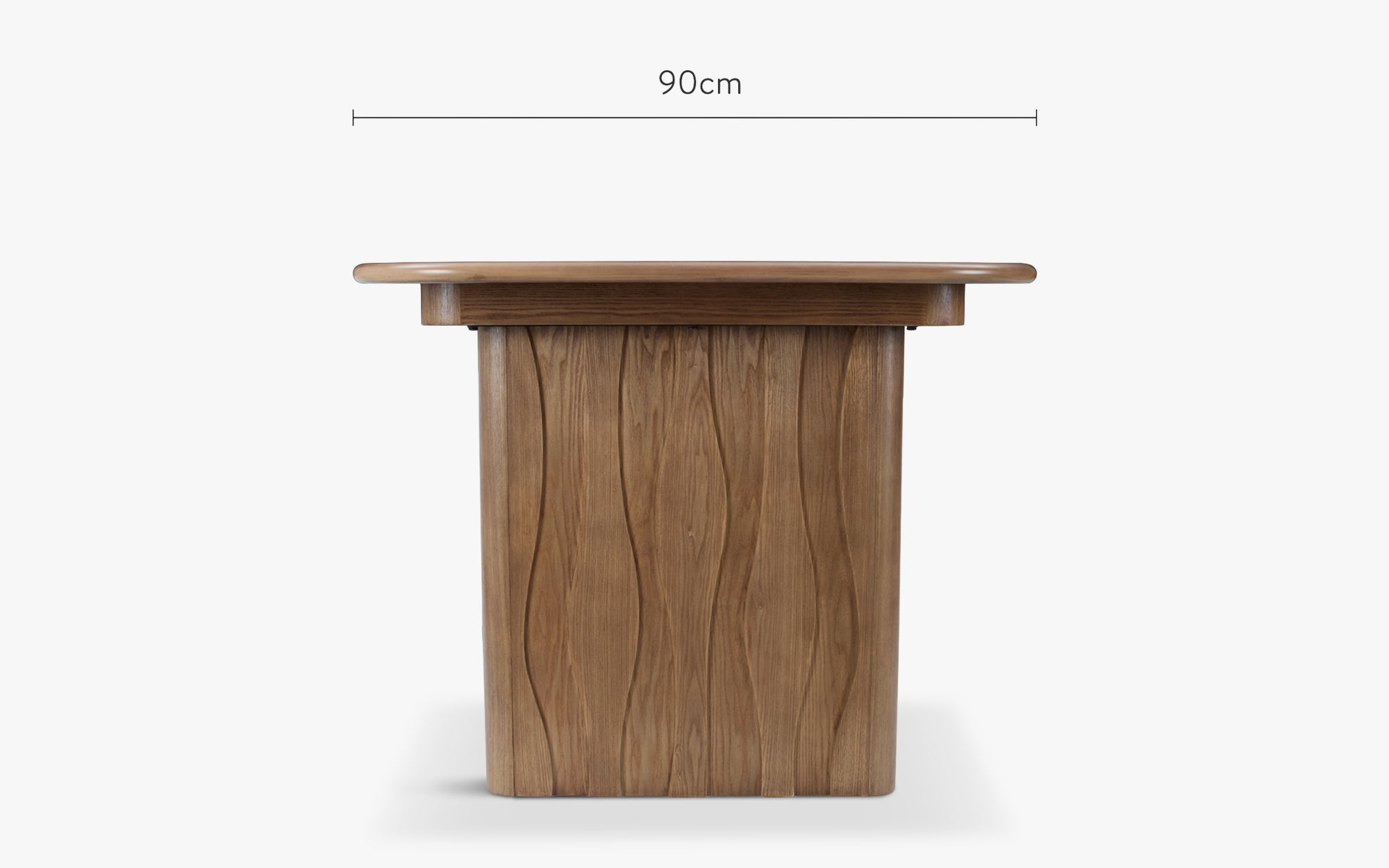 Der Esstisch ONDULA besticht durch ein ausdrucksstarkes und poetisches Design, das nahtlos die Ästhetik der gesamten Kollektion widerspiegelt. Seine imposanten Tischbeine, in Hochrelief gearbeitet, zeigen ein subtiles Spiel aus Kurven und Gegenformen. Diese wellenförmigen Vertiefungen im Holz erzeugen eine fast greifbare Materialität, die das Licht einfängt und dem Tisch Tiefe verleiht. Die sanft abgerundeten Kanten der Tischplatte unterstreichen dieses Gefühl natürlicher, fließender Eleganz.