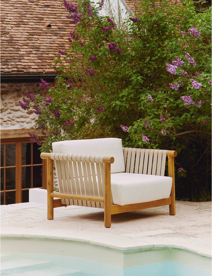 Unsere Rückgabebedingungen lesenDer Sessel BEXLEY vereint Komfort und Eleganz und kombiniert beigen Stoff und Holz für eine raffinierte Sitzfläche, die sich ideal für den Außenbereich eignet.