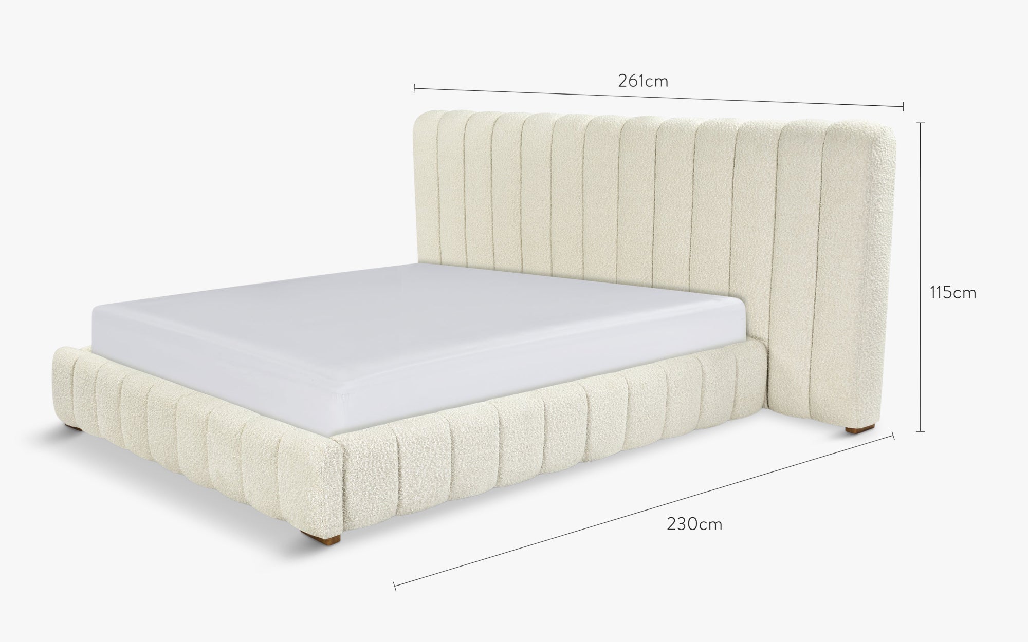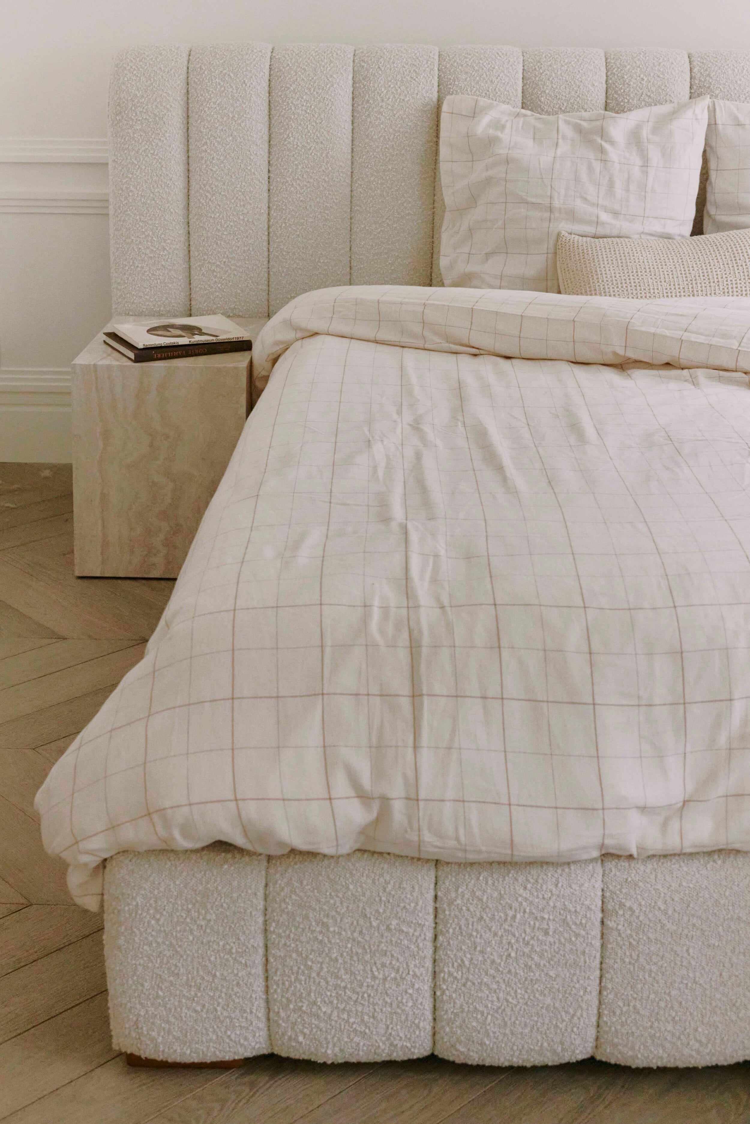 Bett 160x200, Bouclé Stoff in Oatmeal Weiß & Holz