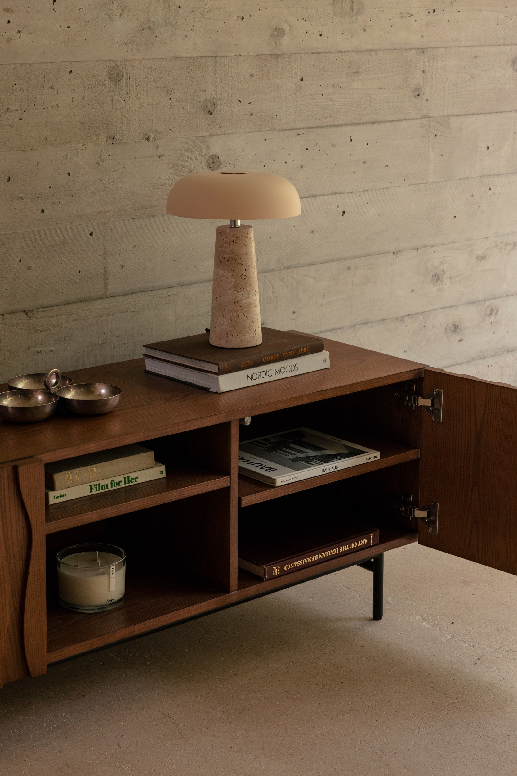 Unsere Rückgabebedingungen lesenDie minimalistische und organische Lampe AMANITA mit Travertinfuß und beigem Metallschirm besticht durch ihr skulpturales und schlichtes Design.