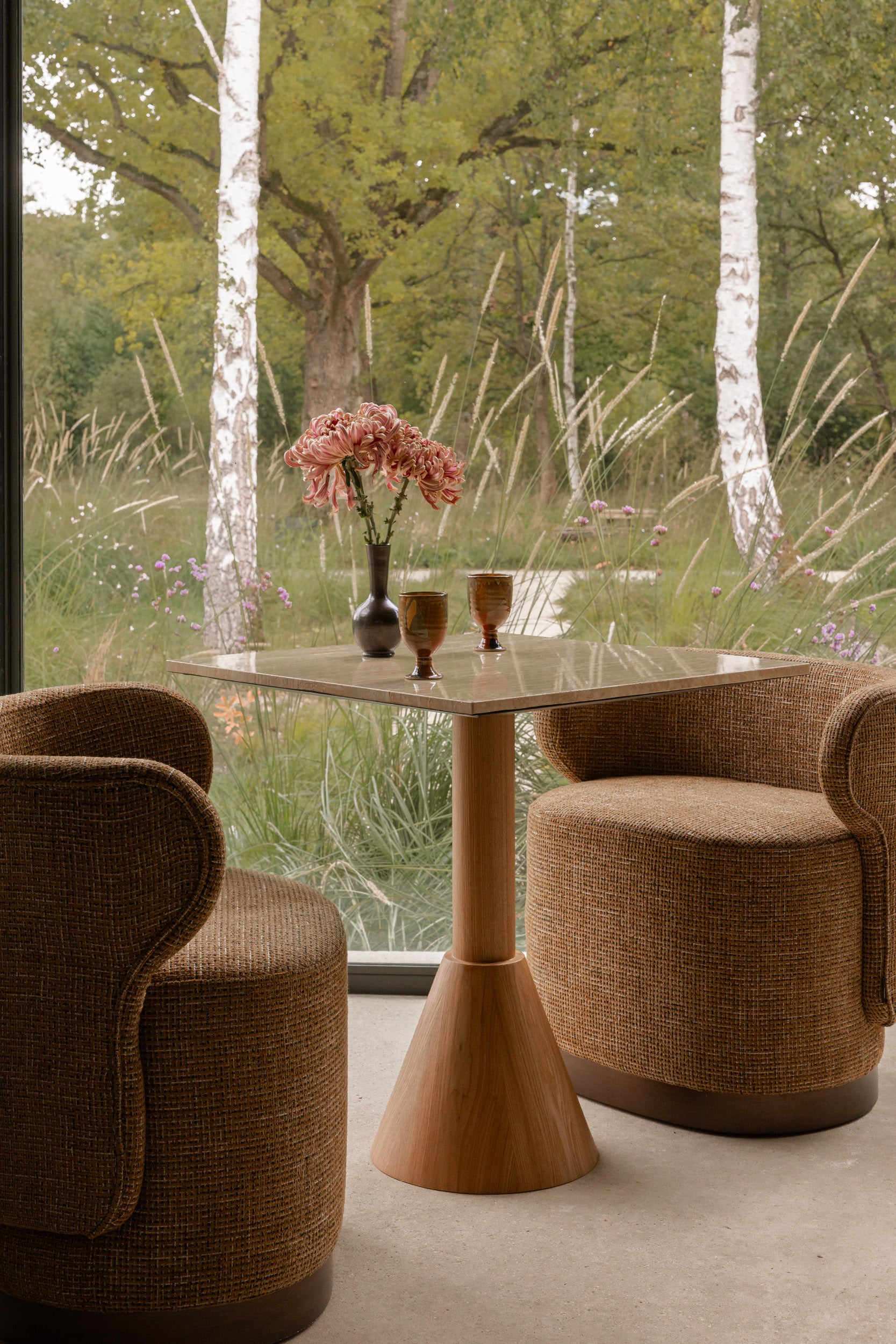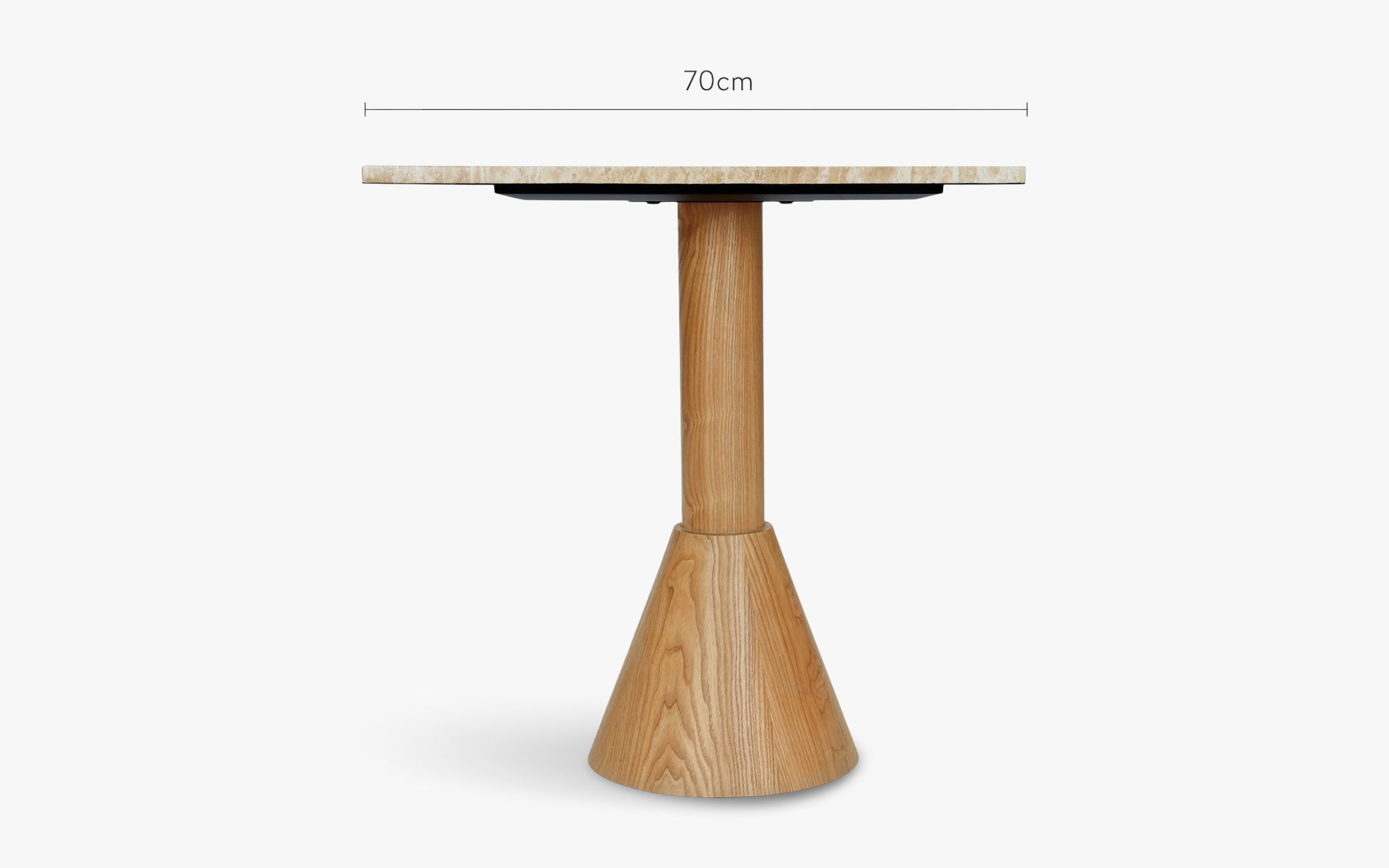 Dining table, for 4 persons, Travertine & blond wood, Ø70