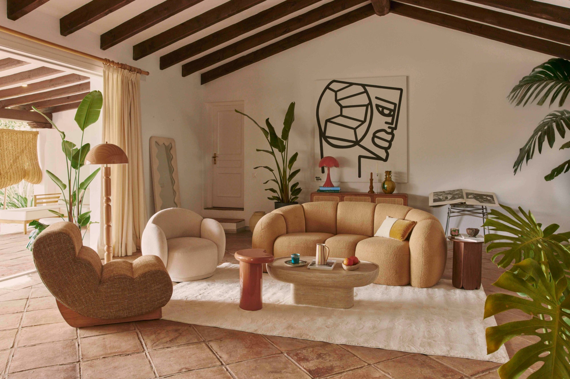 Inspired by petals, rounded shapes and ergonomic cushions: cocoon sofa, protective and decorative cocoon.