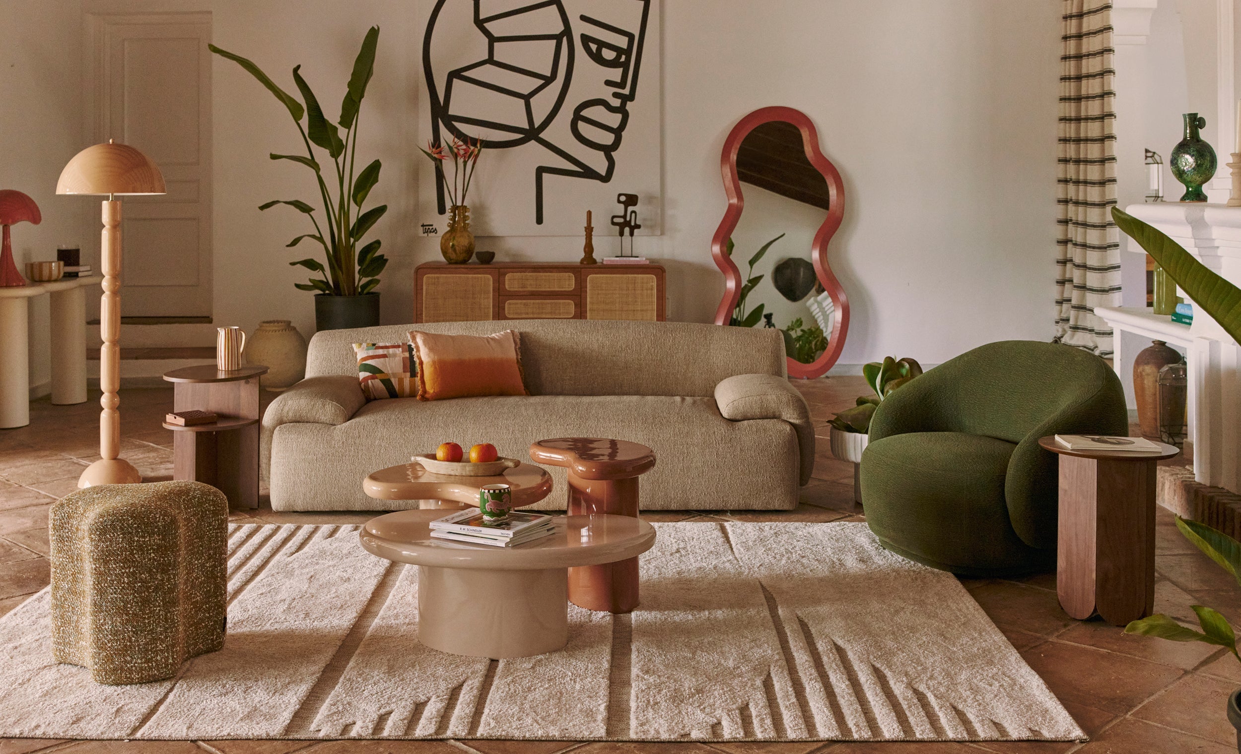 The Takoo pouf, in creamy or tweed Sahara, is practical and decorative. Associated with the Coba bench, he created a warm visual harmony.