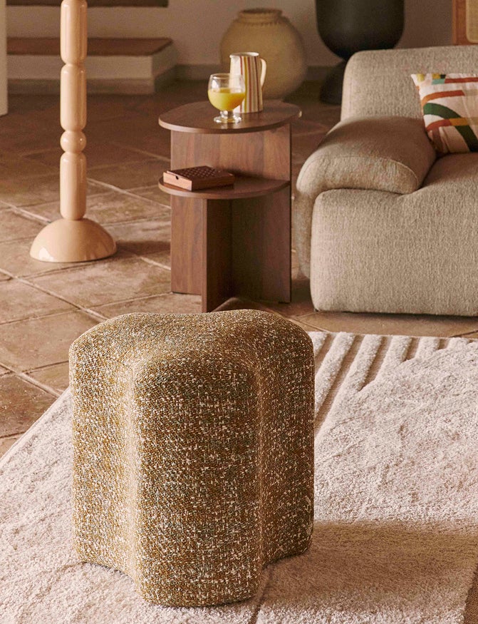 Available in two textures and two colors, a cream white bouclé and a Sahara brown tweed, the TAKOO pouf adapts to any type of environment. While it can stand alone as a decorative element, it also excels in its practical role as a footrest or extra seat. In order to create a real visual harmony in the heart of the home, we imagine it very well associated with the COBA bench, both in its speckled yellow and Sahara brown versions. While the TAKOO footrest focuses on geometric finishes, the COBA bench brings a more elongated line thanks to its thin black legs, without putting comfort aside with its seams that give it a particular relief. Both will flourish next to a sofa with soft lines, at the foot of a bed or anywhere where seating is lacking.