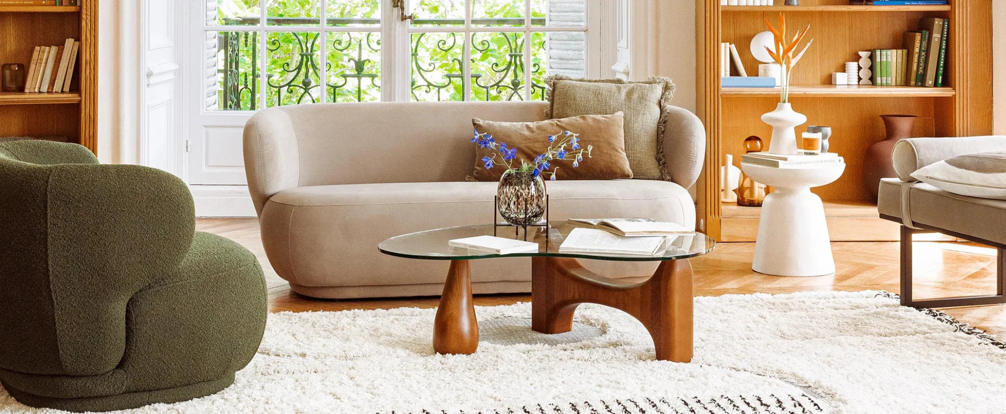 • A green velvet sofa paired with a wooden coffee table, for a chic, welcoming atmosphere.