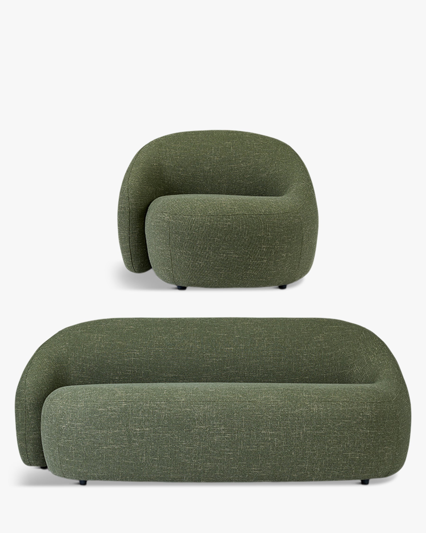 NEO, poltrona e divano dalle linee curve e sedute generose. Disponibili in bouclé e tweed, uniscono comfort, design e uno stile senza tempo.