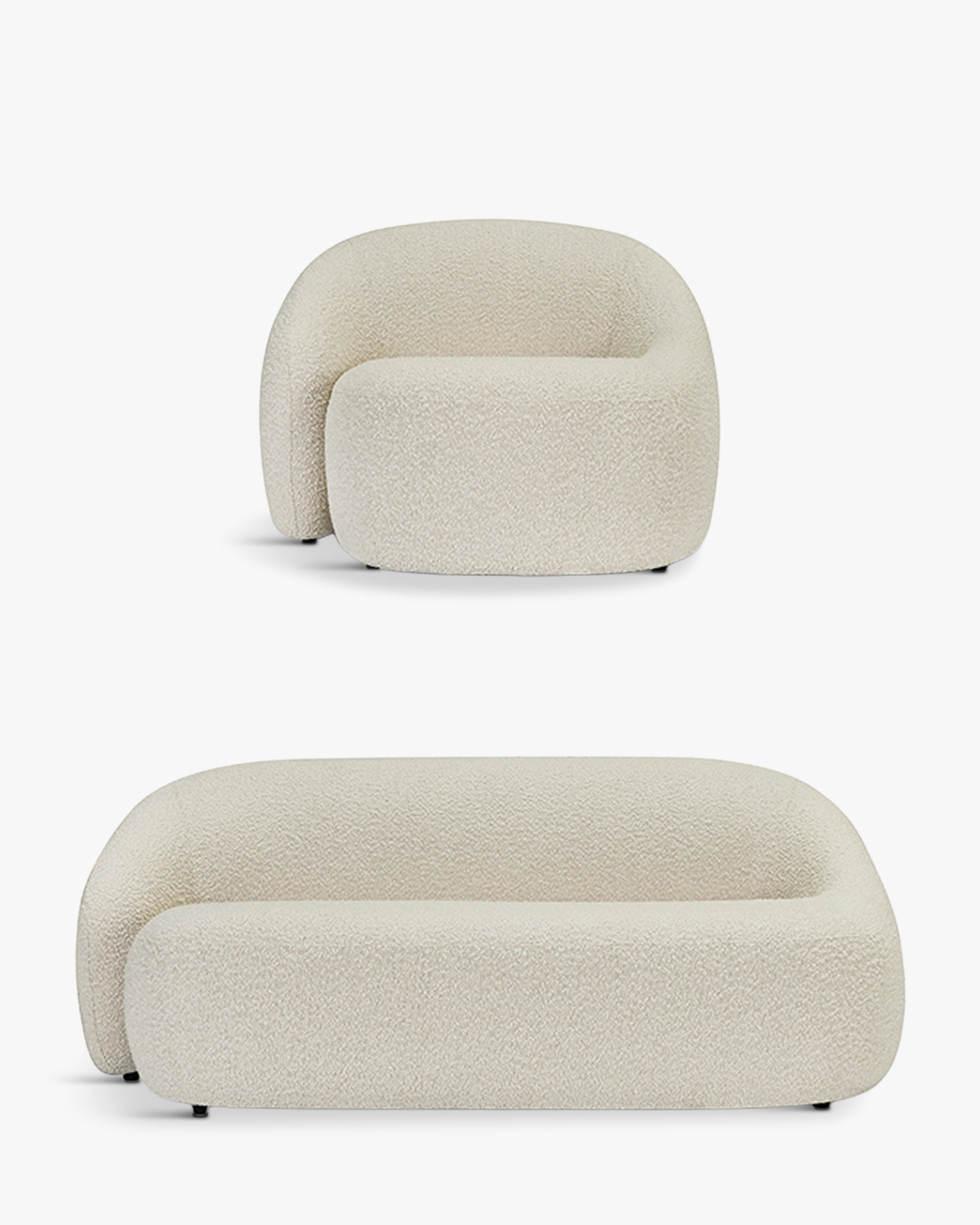 NEO, poltrona e divano dalle linee curve e sedute generose. Disponibili in bouclé e tweed, uniscono comfort, design e uno stile senza tempo.