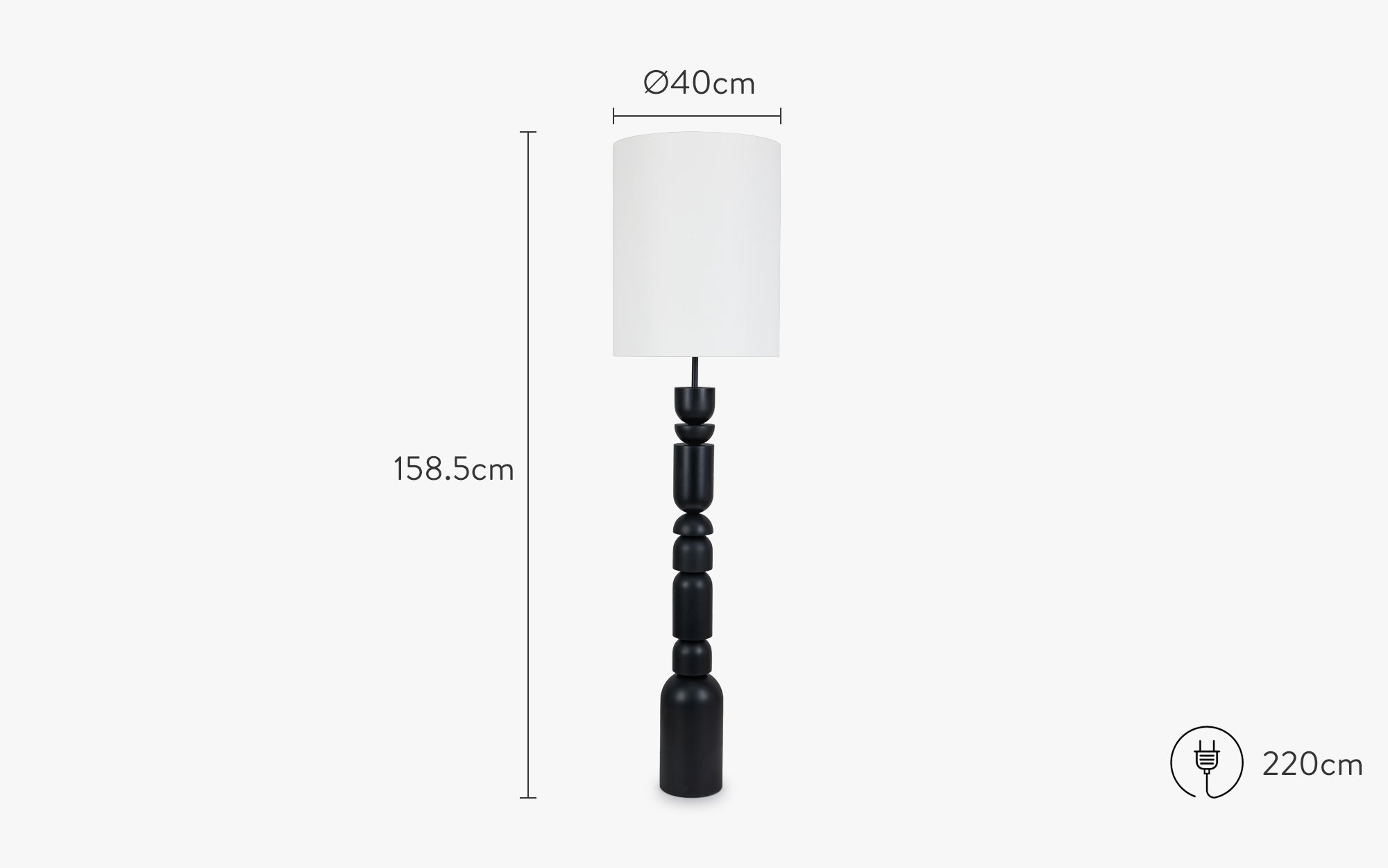 Read our returns policyThe TINGA floor lamp asserts a slender totemic silhouette, blending geometric volumes in carved black rubberwood. Its cylindrical lampshade diffuses a soft and balanced light.