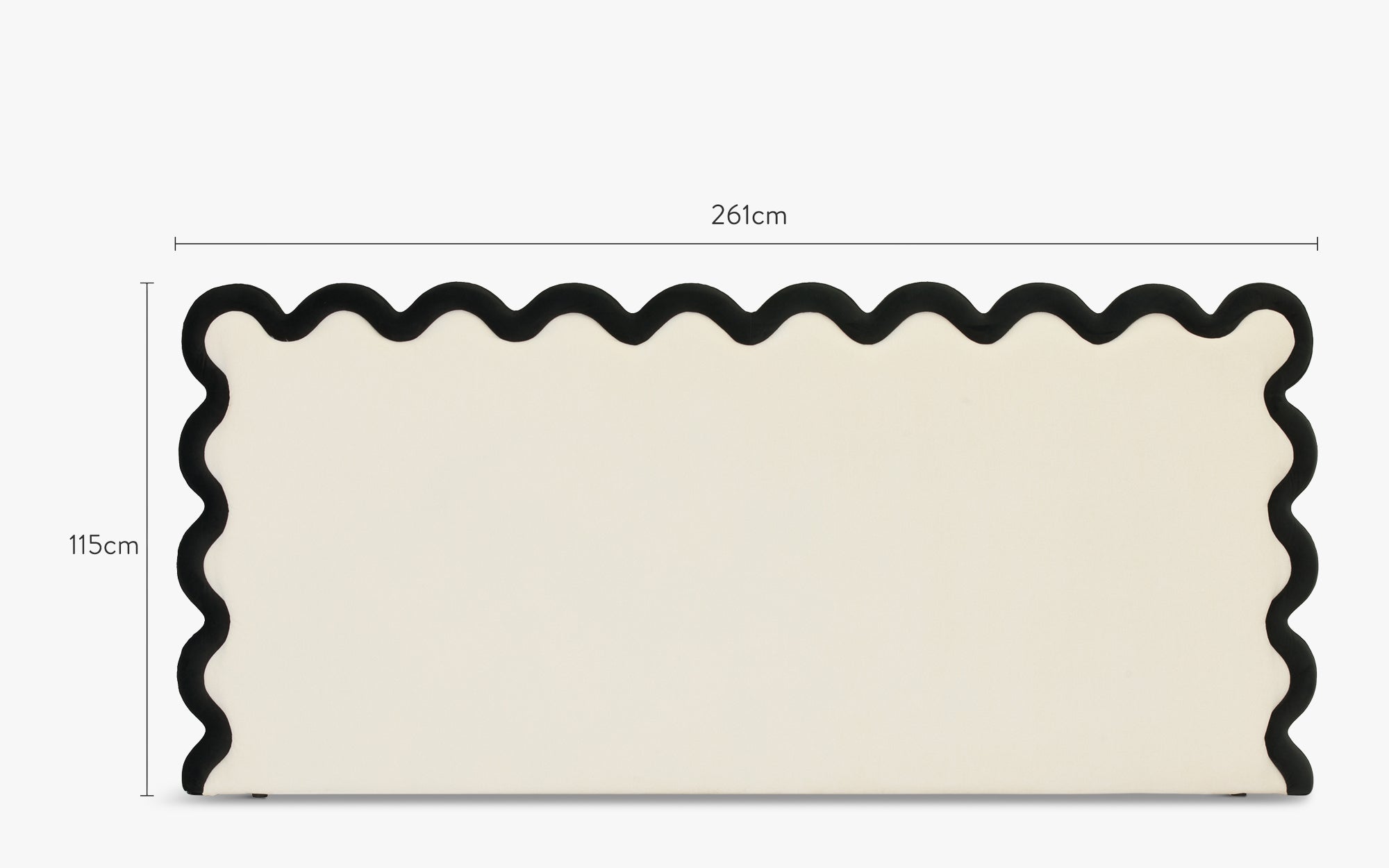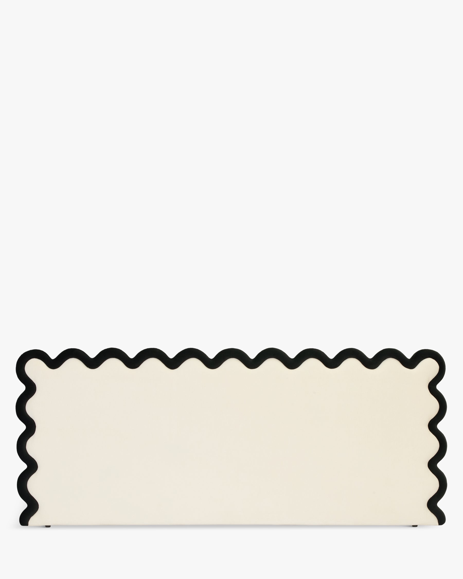 Read our returns policyAria headboard, corrugated and sculptural outline, black velvet contrast/ecru plush, contemporary room.