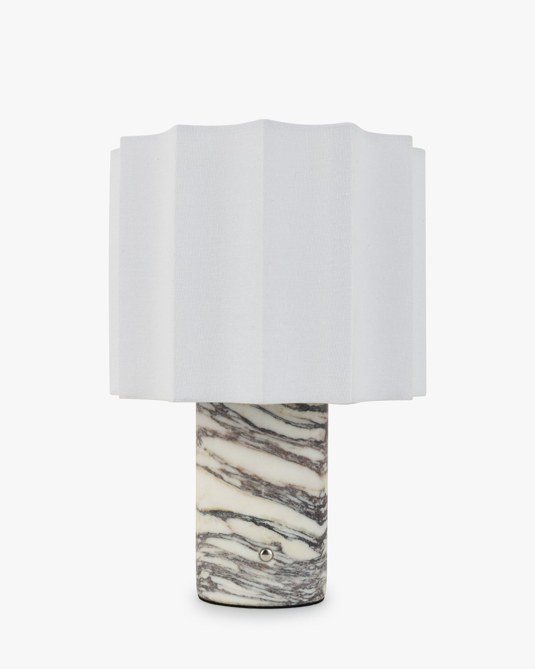 The BRIDGET portable rechargeable table lamp stands out with its elegant silhouette, combining soft volumes and rhythmic vertical lines. The pleated lampshade diffuses a warm light, while the marble-effect base adds a refined, graphic touch to the overall design.