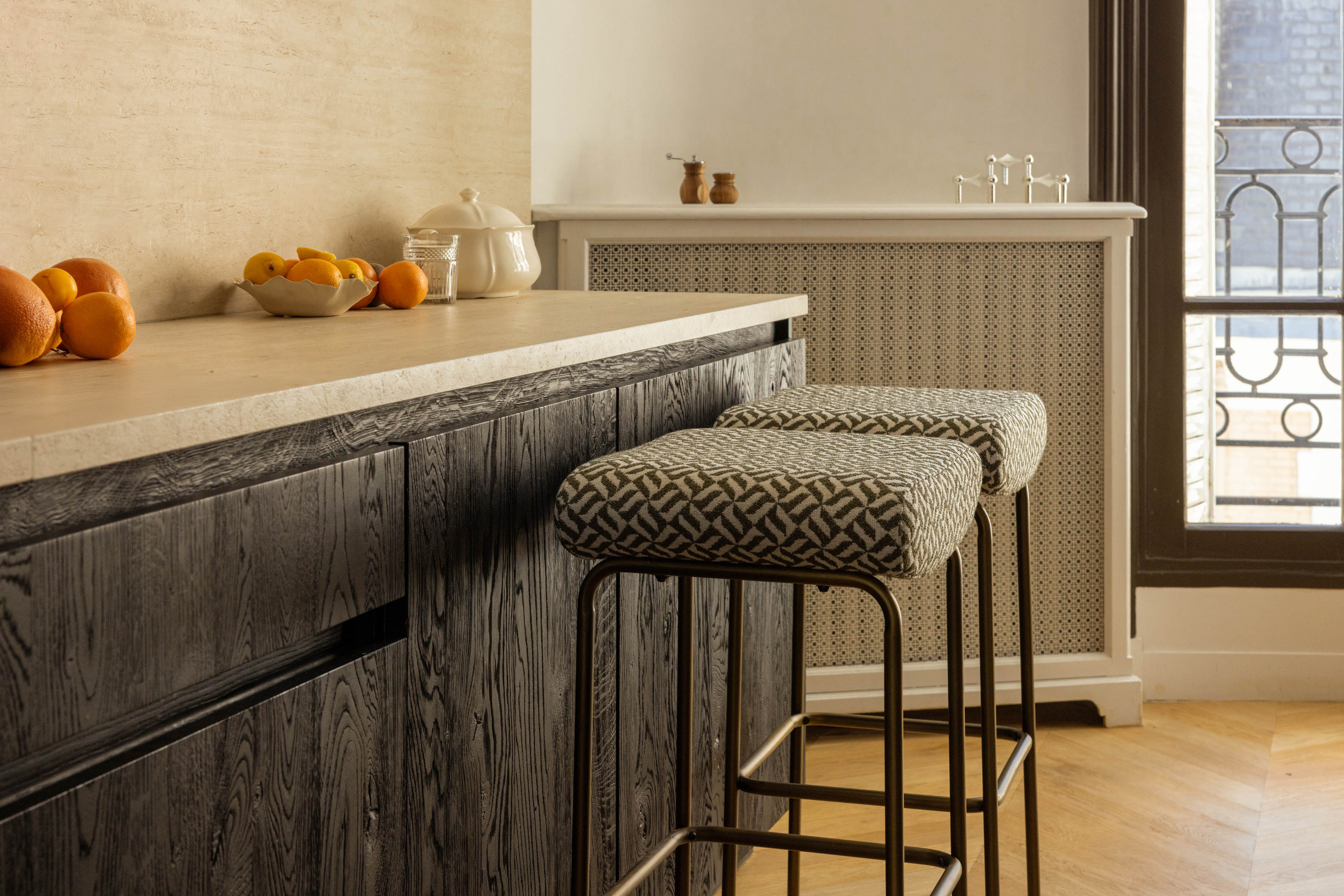Lire nos conditions de retoursLe tabouret CLEMI séduit par son assise vert sapin à motifs géométriques et son design minimaliste au caractère affirmé.