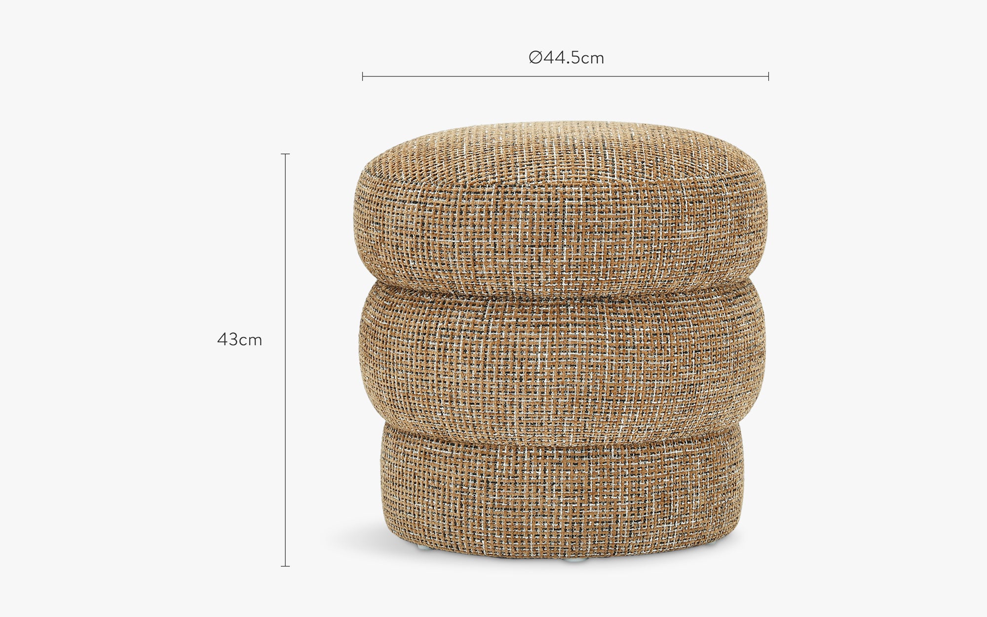 Lire nos conditions de retoursEn tweed caramel, le tabouret MDINA joue sur les volumes superposés. Sa silhouette organique et architecturale capte immédiatement le regard.