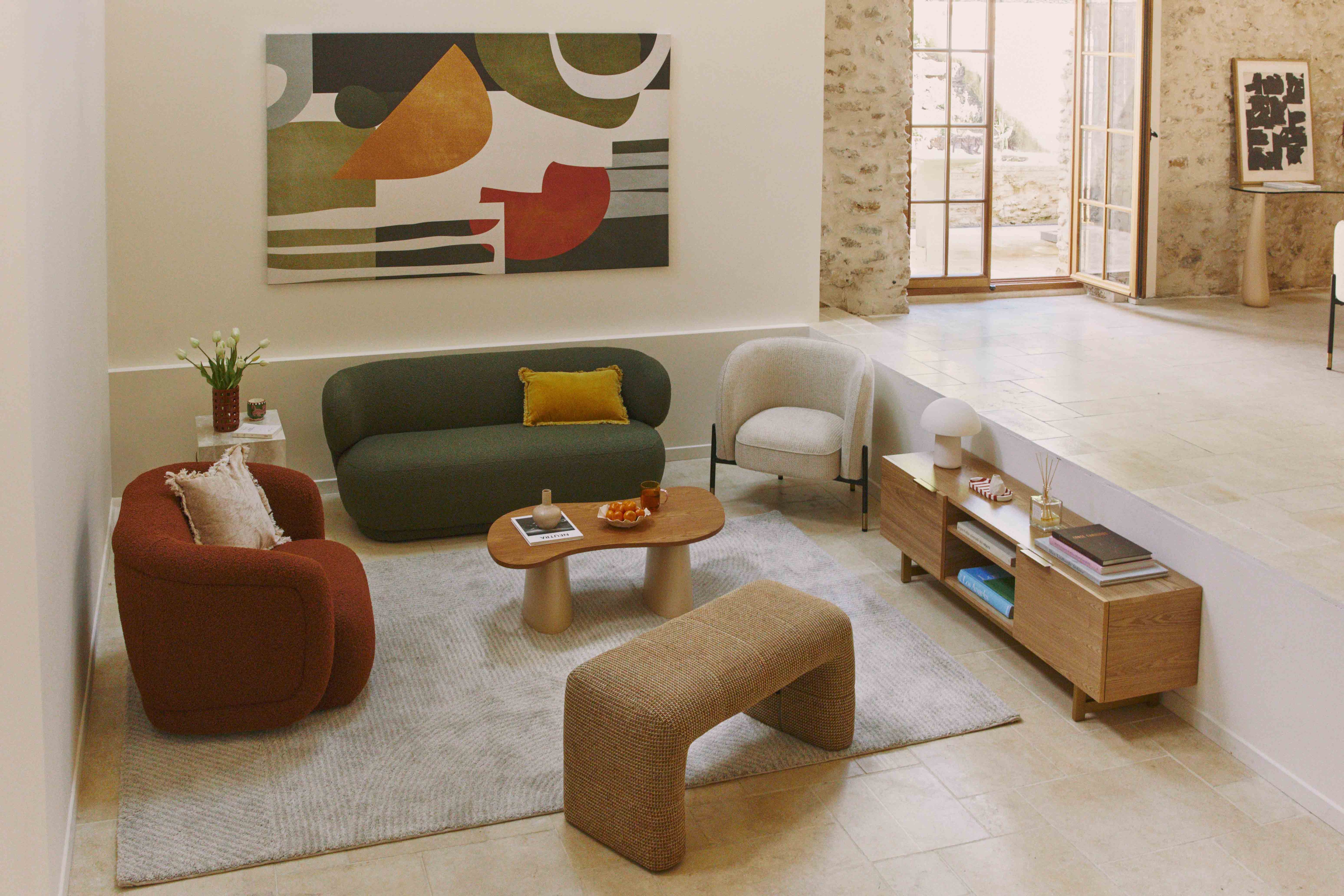 Le banc MEEKO, léger et mobile, se décline en bouclé ou tweed et coloris variés pour s’adapter à chaque intérieur.