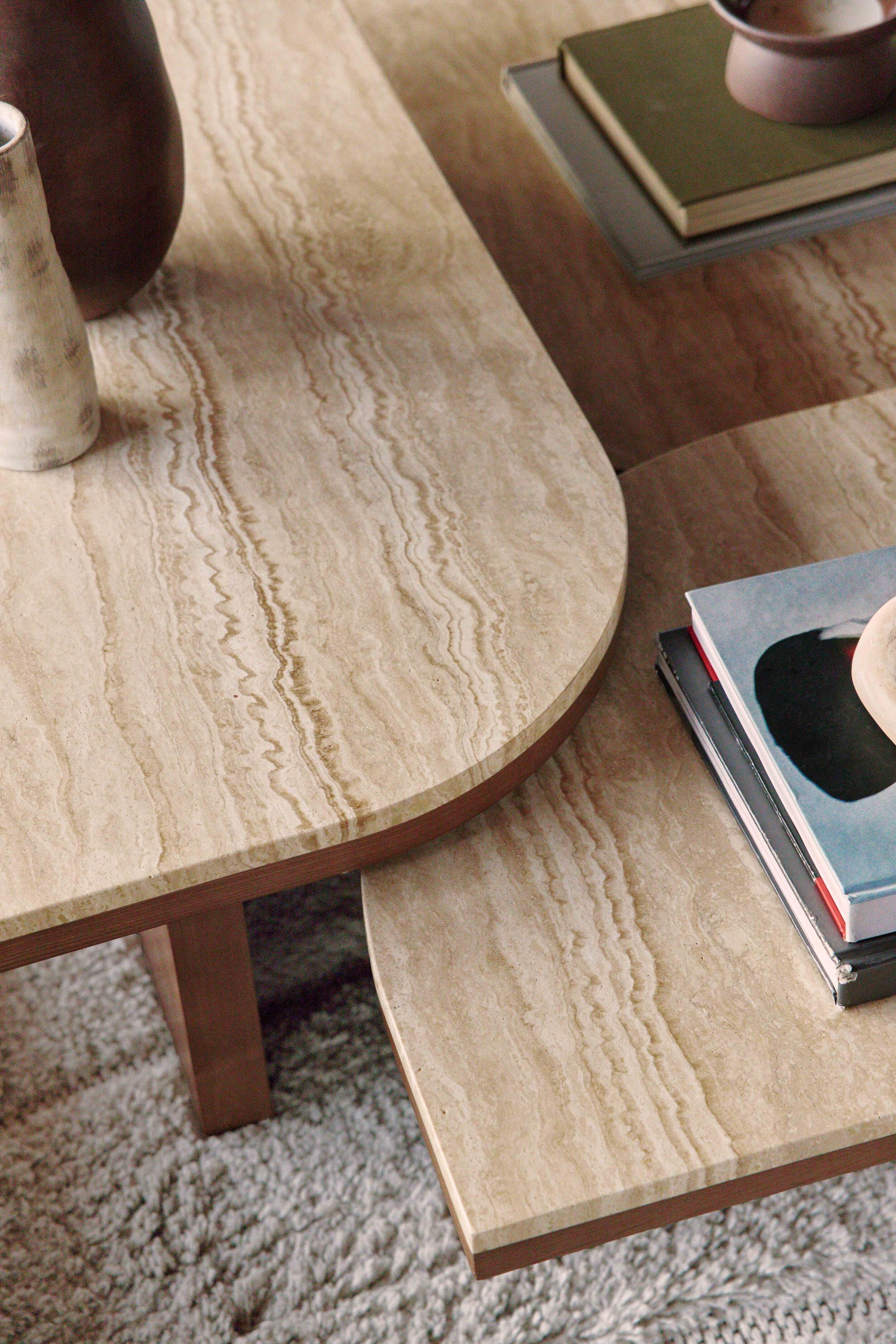 Table basse, L85, Travertin waterproof & bois de frêne teinte noyer