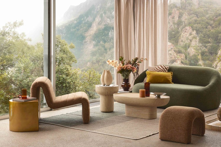 Ensemble fauteuil + table d'appoint, Bouclette marron + beige glossy