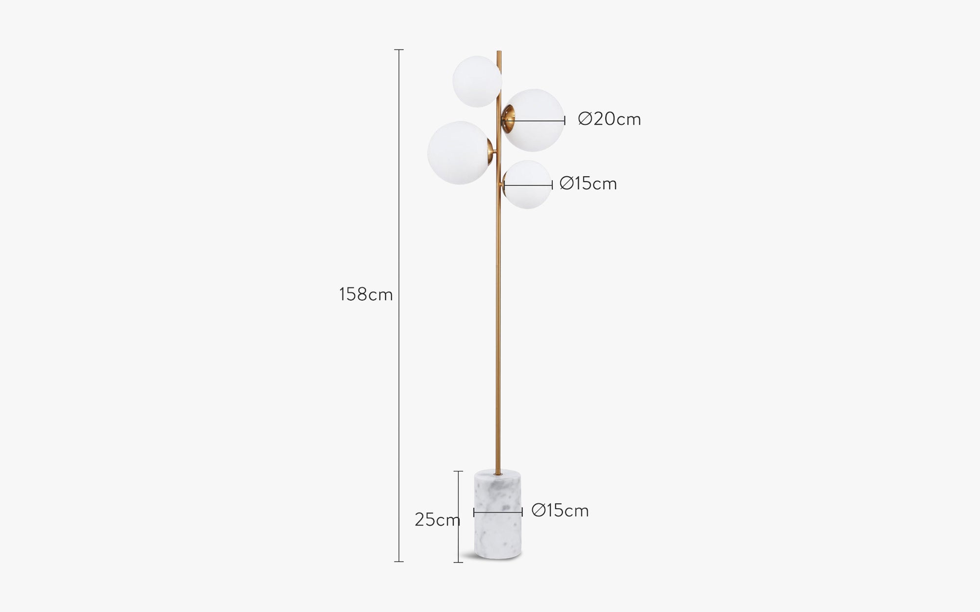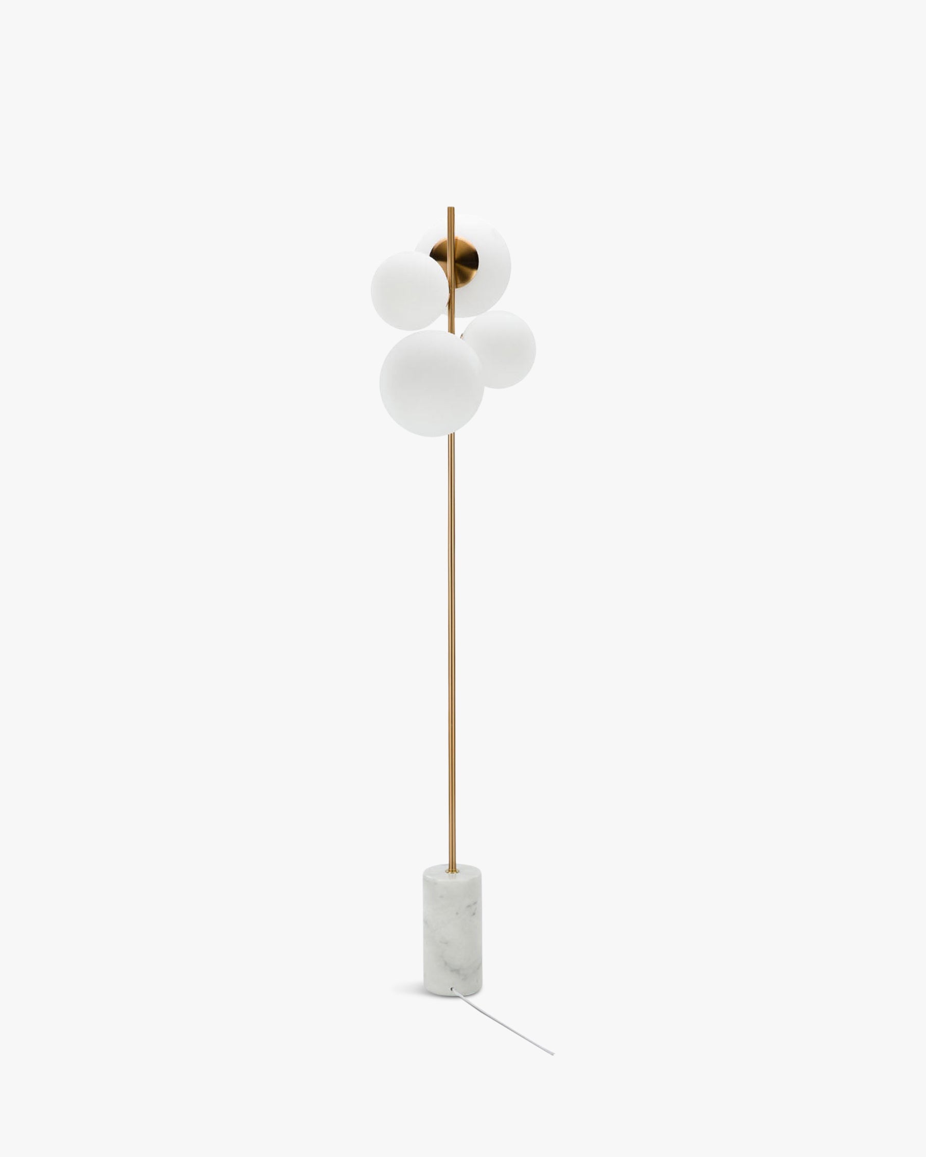 Vloerlamp, witte bollen, wit marmer en gouden metaal, H158