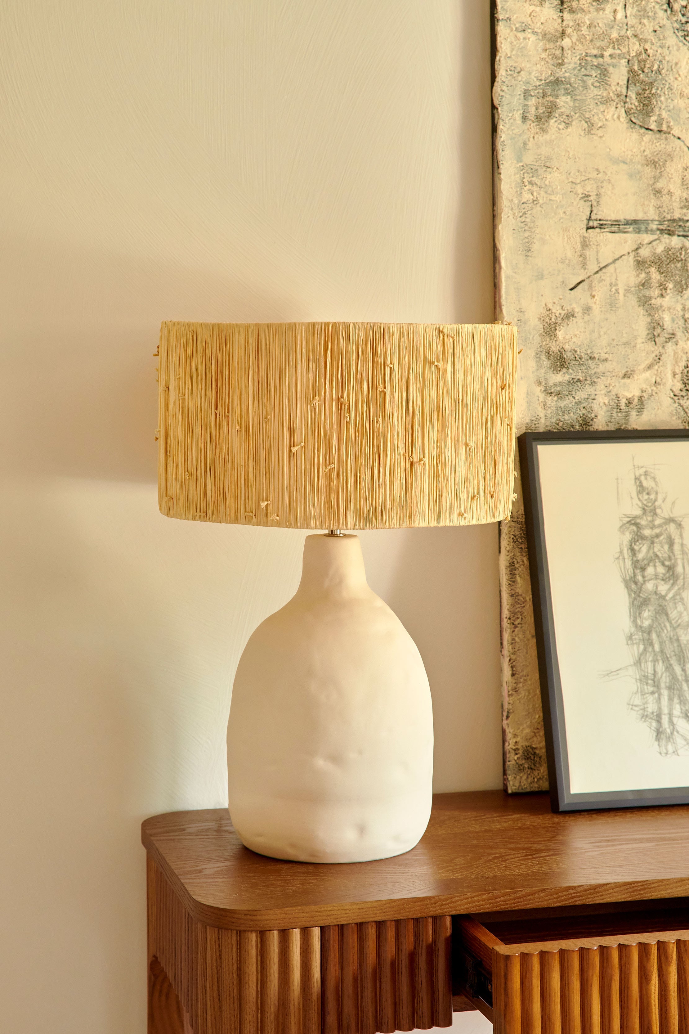 Tafellamp, Raphia en witte keramische lampenkap, H51