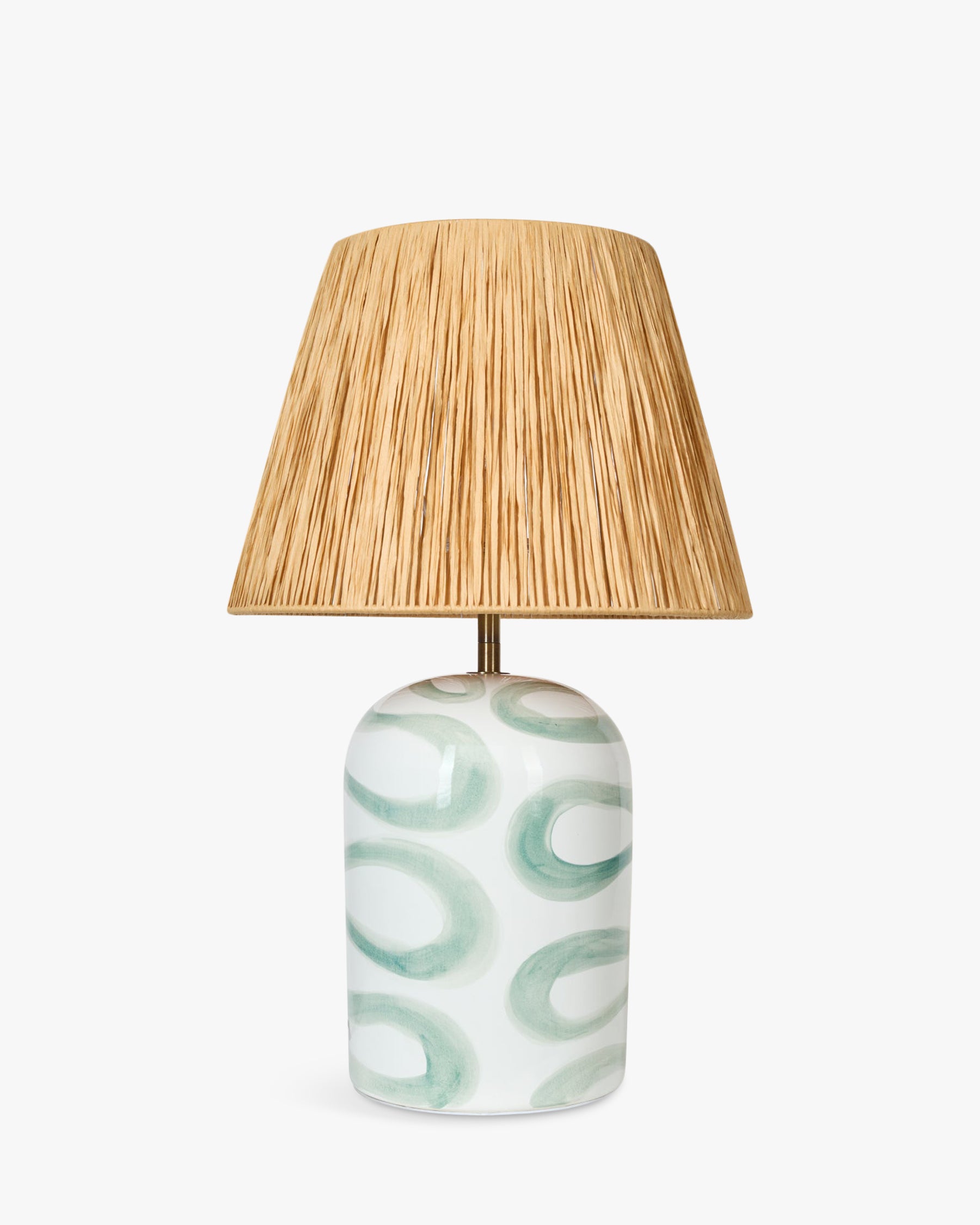 Lees ons retourbeleidDe tafellamp SAVANNAH van beschilderd keramiek en een kap van raffia werpt een zacht licht met een bohemienachtige, organische charme.