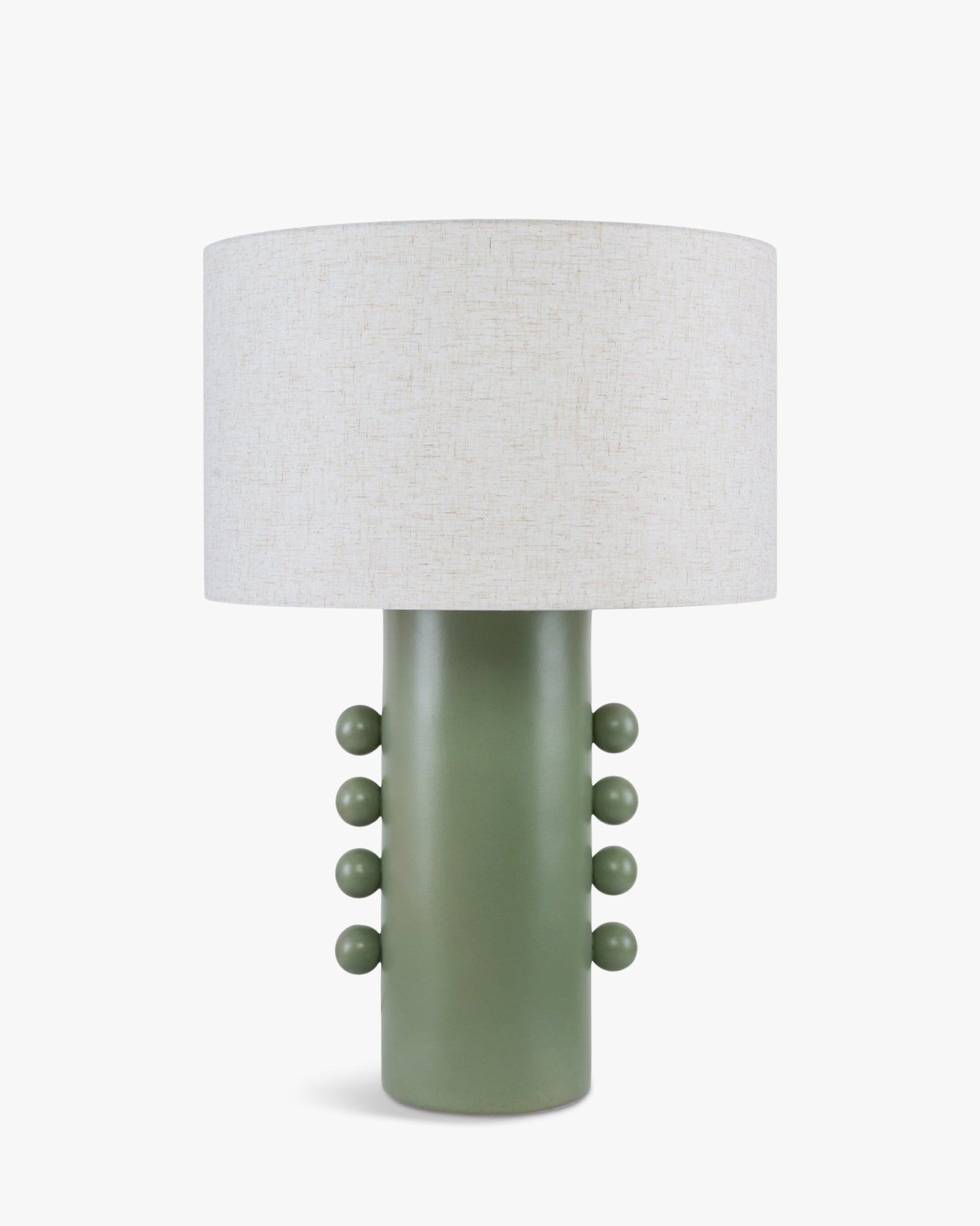 Lees ons retourbeleidDe SOLI tafellamp fascineert met zijn sculpturale groene keramische voet en zachte kap, een perfecte balans tussen vorm en textuur.