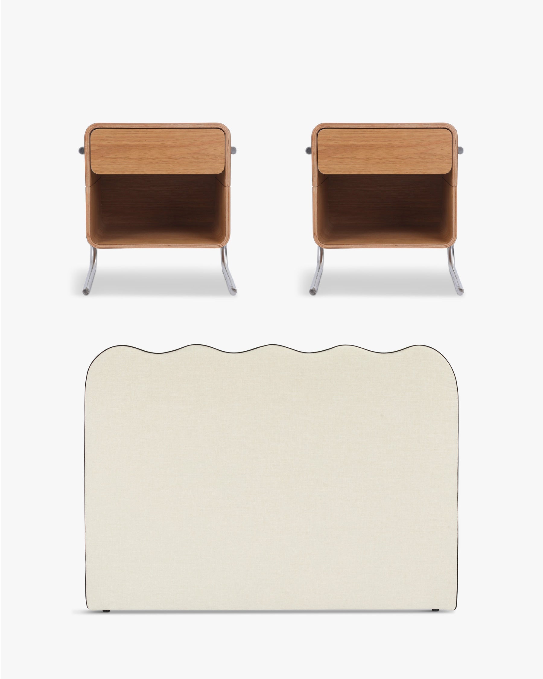 L'ensemble de 2 tables de nuit ANDRIA + tête de lit ATLANTE : le charme retro pour le rangement associé au mouvement apaisant du design organique pour encadrer la literie.