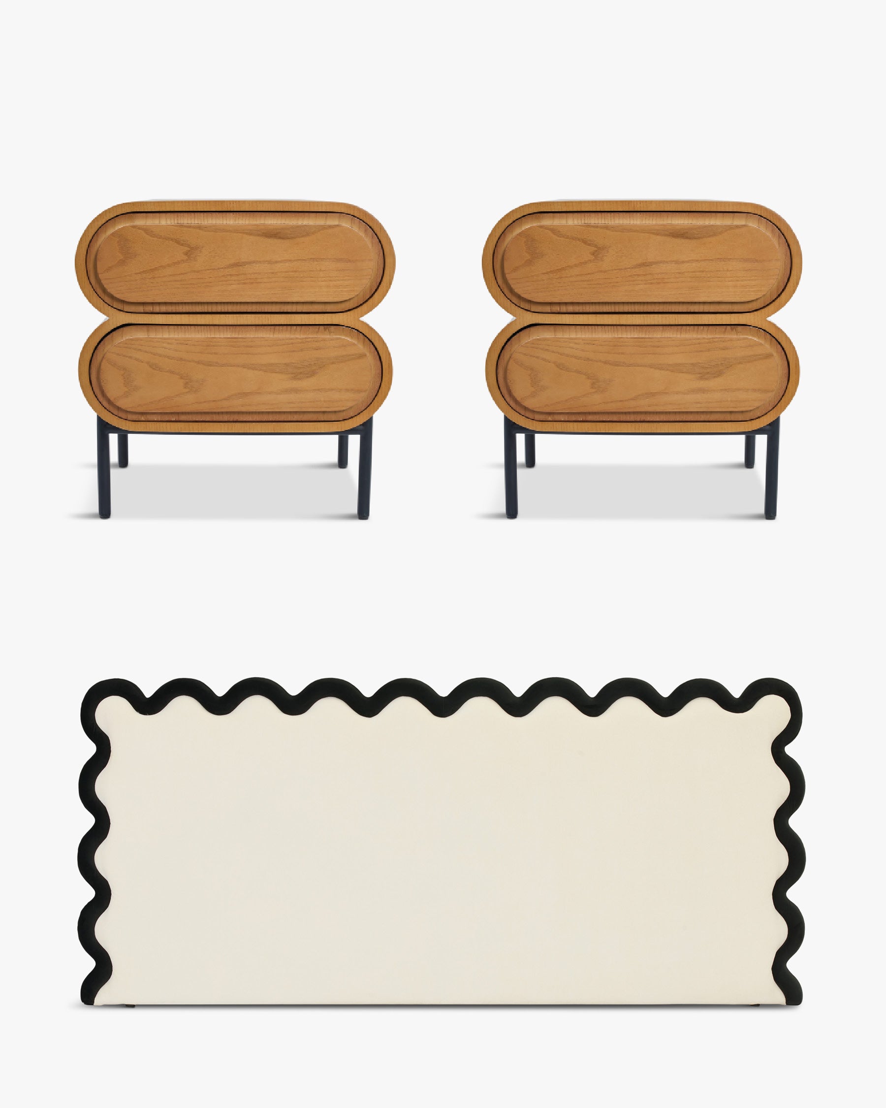 Le combo tête de lit + 2 tables de chevet : la facilité d'un ensemble au design organique et pratique pour créer un espace nuit à la douceur retro cosy !