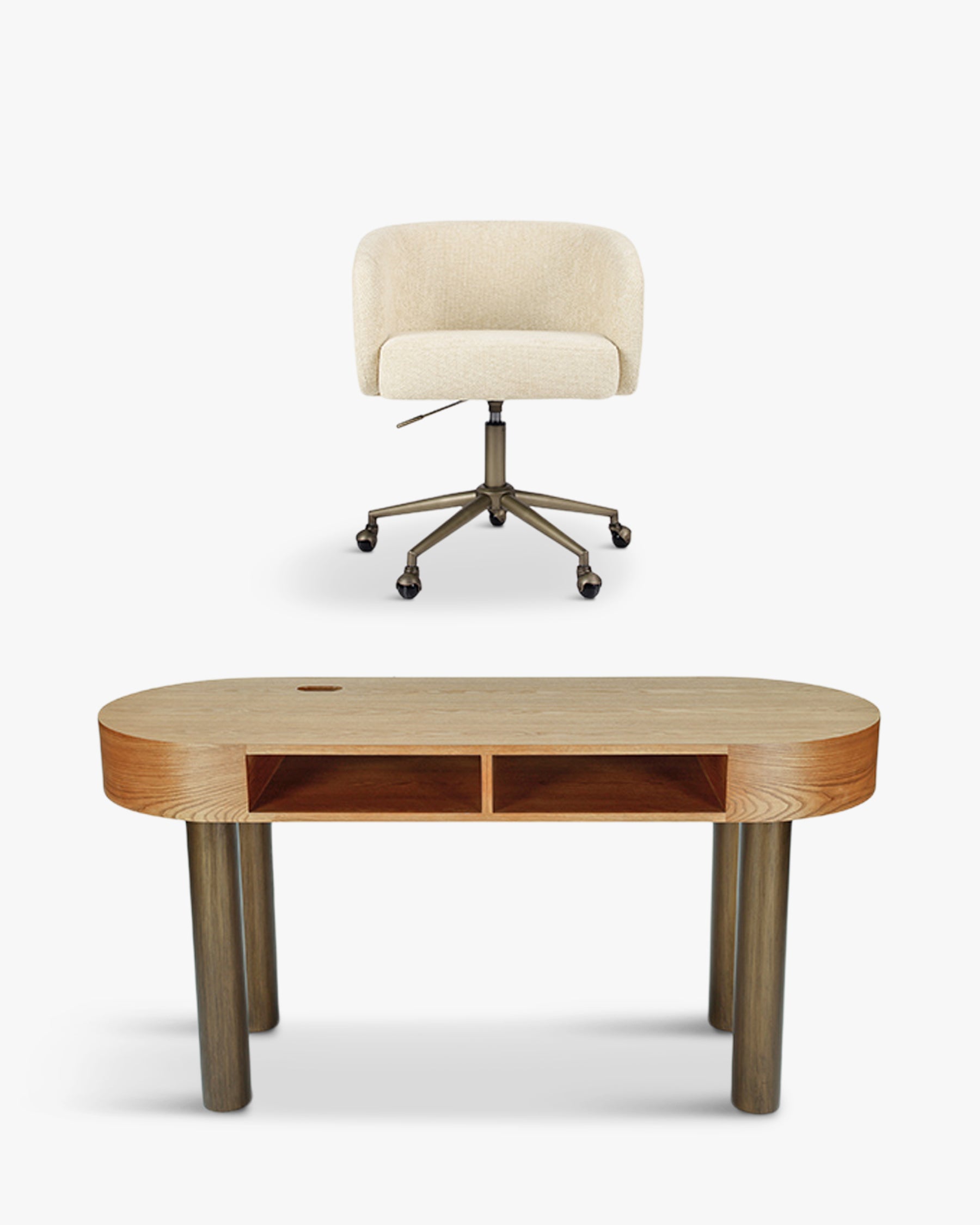 VOLTA + SHELDON – Chaise rotative en tweed sable et laiton avec bureau en bois blond : un duo pratique et chic pour télétravail ou bureau.