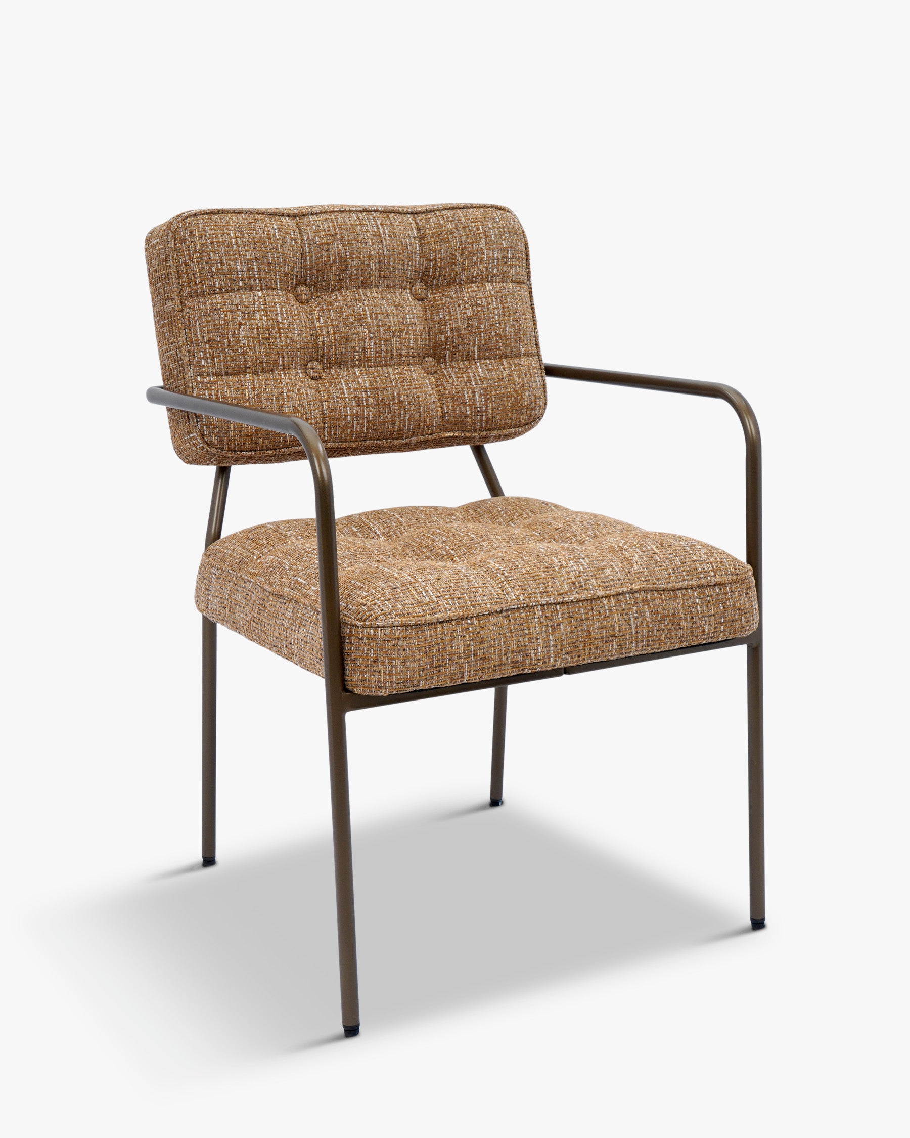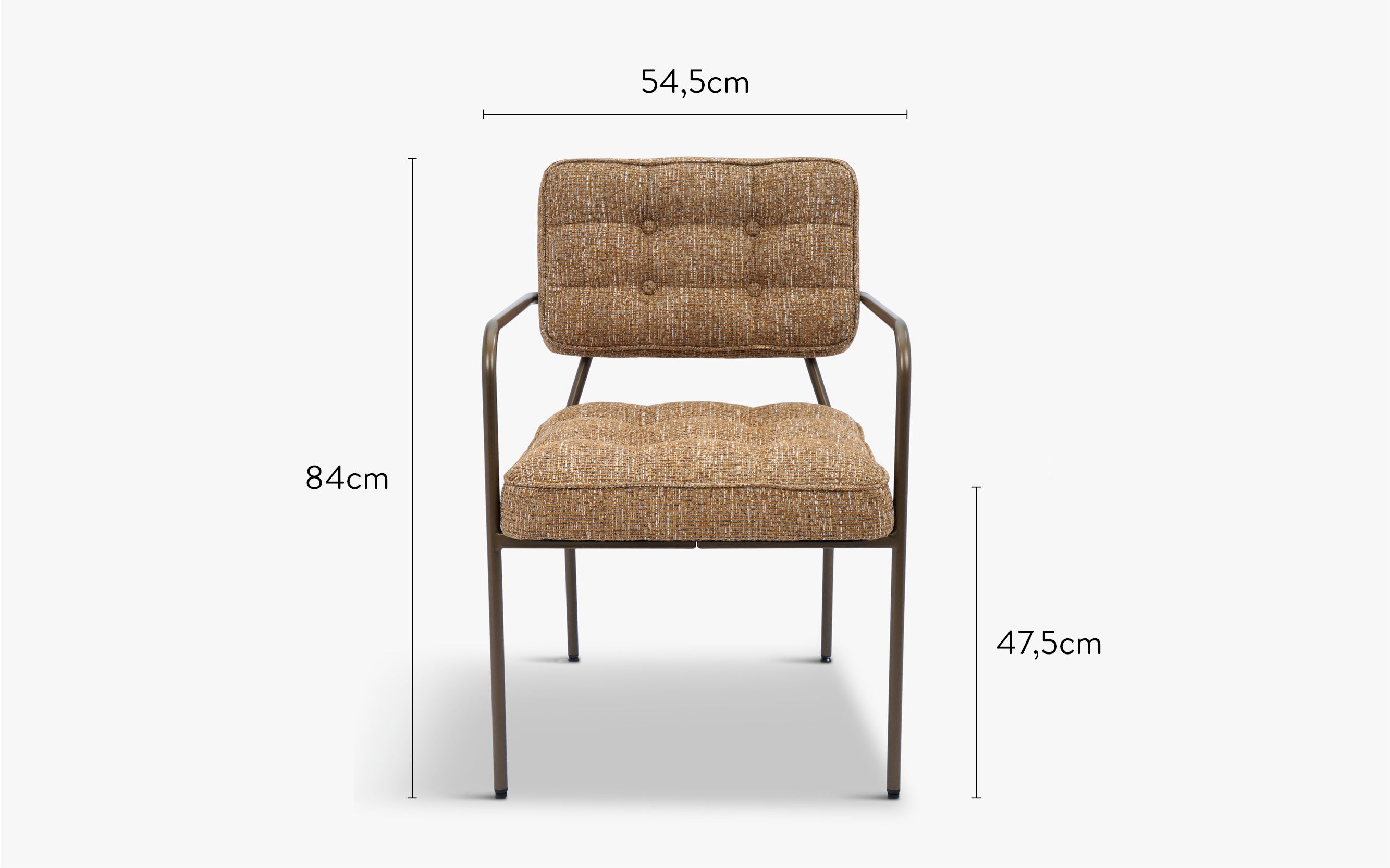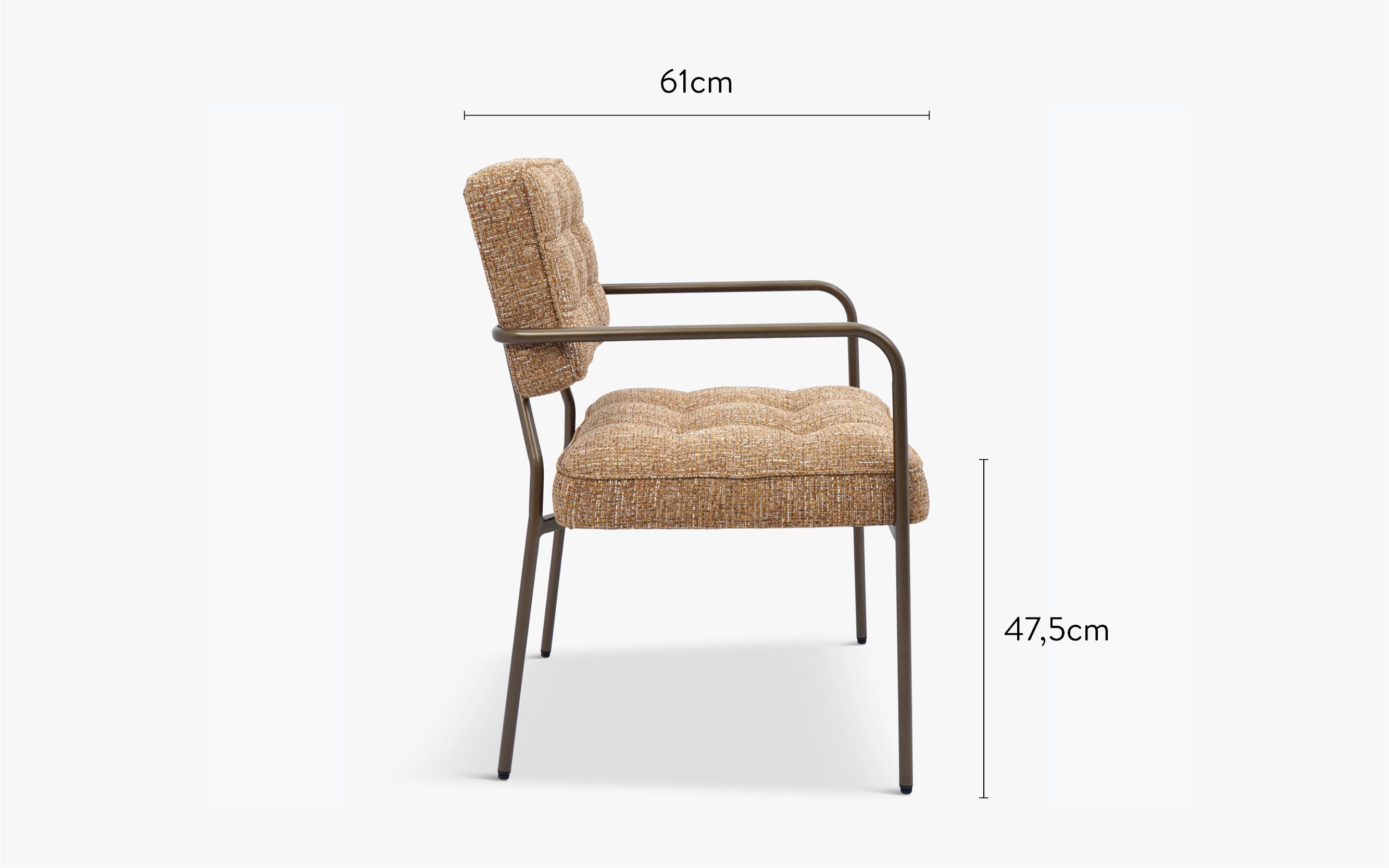 Lire nos conditions de retoursLa chaise OREA revisite l’esprit 70’s avec un boutonnage graphique structurant, prolongé par des accoudoirs épurés et une structure bronze affirmée.