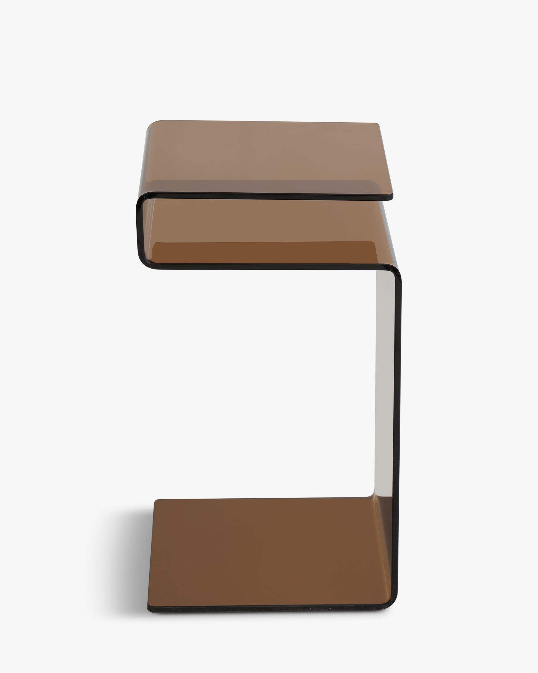 Avec son verre ambré transparent, la table d’appoint AMBRA et sa silhouette en S, offre un clin d’oeil chic et retro pour l’intérieur de la maison. La conception fluide et organique de sa matière, lui permet l’air de rien de profiter de plateaux à différentes hauteurs design de la table AMBRA plateau supérieur suspendu renforce cette impression de légèreté, comme si la pièce défiait l’équilibre. AMBRA s’inspire de l’esthétique lounge des années 70, révélant des reflets chauds qui réchauffent instantanément l’atmosphère d’un salon ou d’une chambre. Son design joue avec la lumière : un jeu de degrés d’opacité et de superposition crée un effet graphique et artistique qui évolue selon l’angle de vue. La transparence se module, oscillant entre ombres et nuances dorées, pour une présence à la fois discrète et hypnotique. AMBRA dépasse ainsi la simple fonction de table d’appoint : elle devient un objet décoratif, expressif et ultra moderne, capable de redessiner l’ambiance d’un intérieur avec une sophistication naturelle.