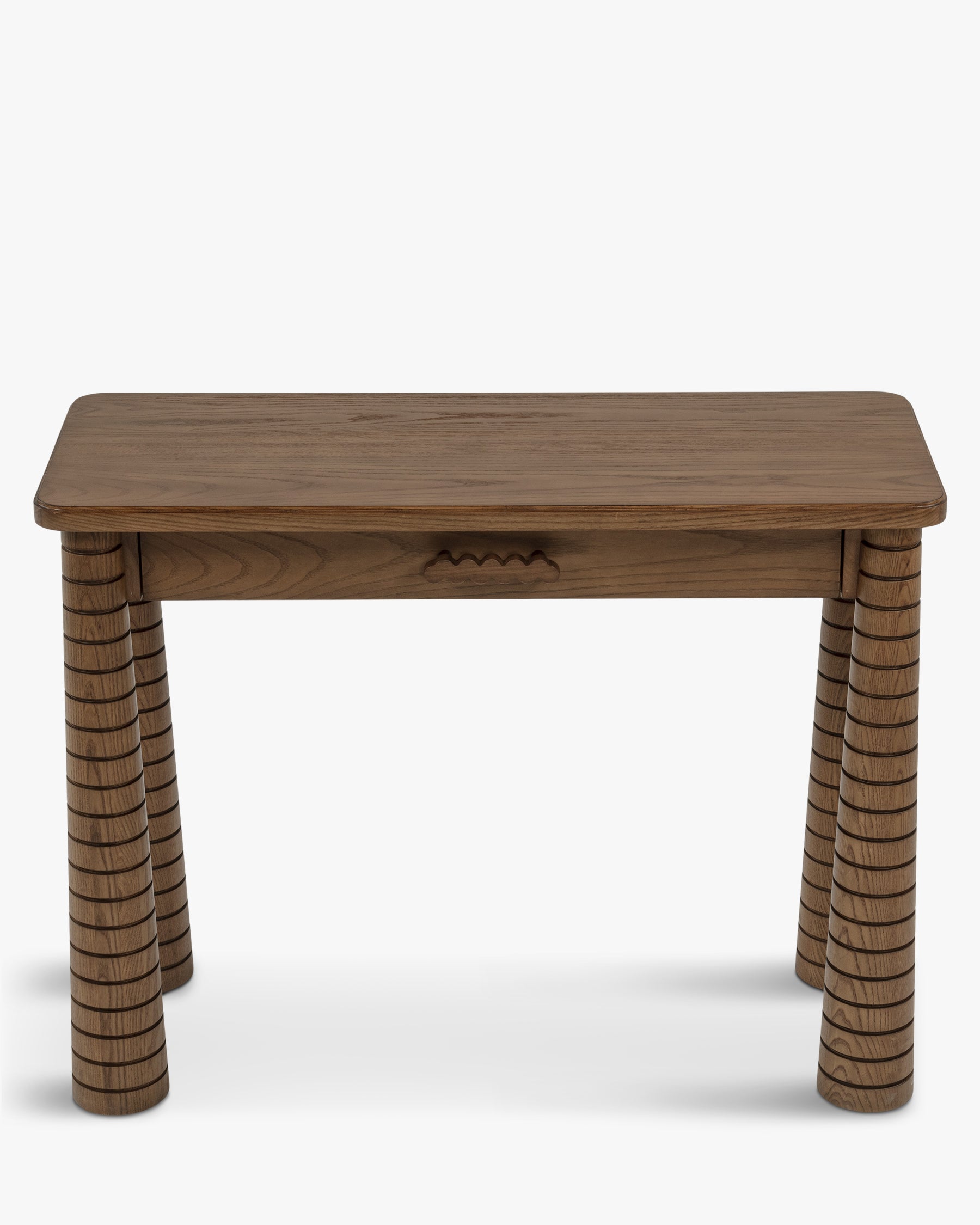 Lire nos conditions de retoursLa console TEMBA en frêne teinté noyer associe pieds coniques sculptés et tiroir intégré, pour une pièce artisanale aussi élégante que fonctionnelle.
