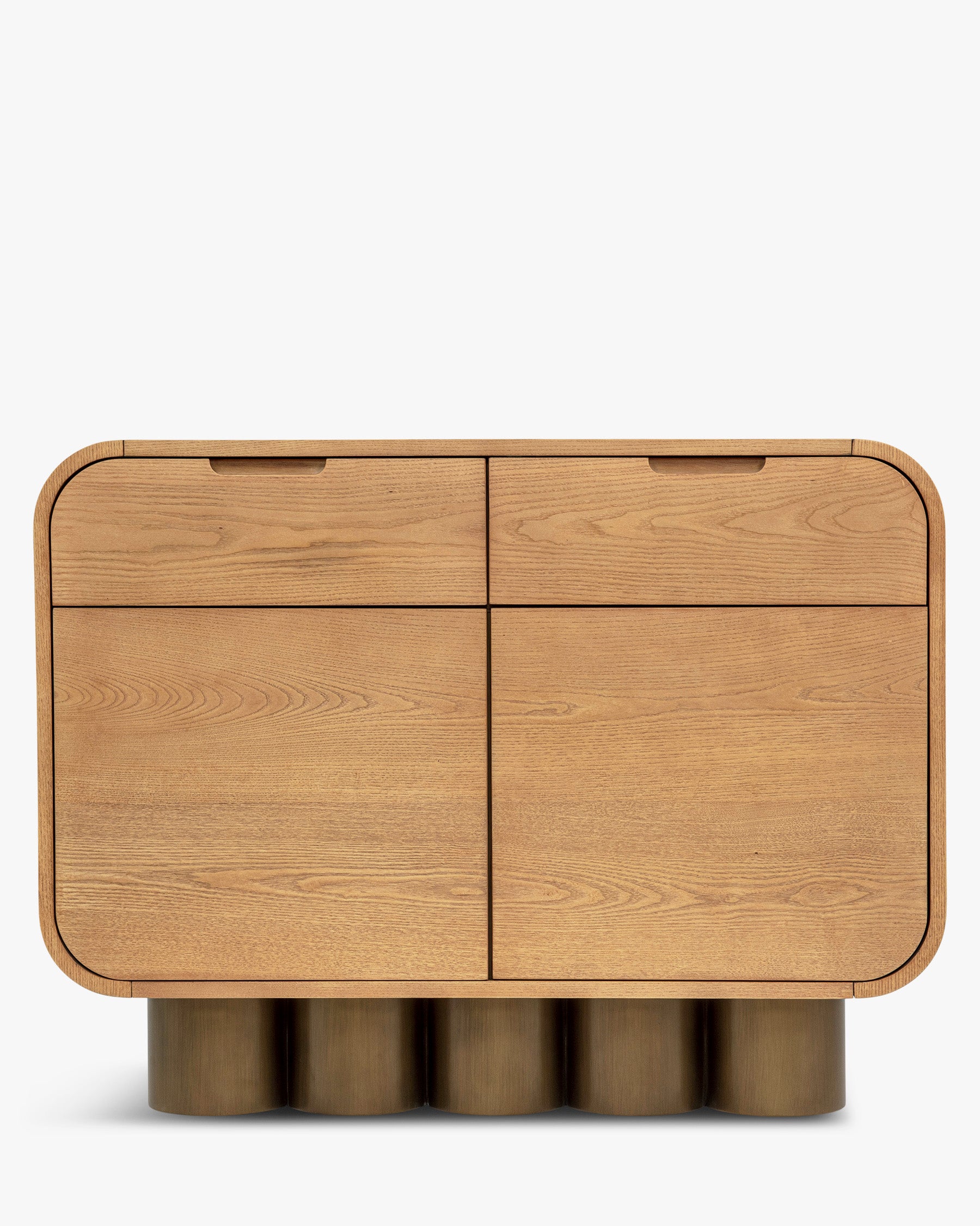 Techniquement, LEYLIA mise sur des finitions irréprochables. Fabriqué en bois d’ingénierie avec placage bois blond, il dévoile un rendu naturel et chaleureux, sublimé par le contraste du piètement en bois revêtu d’une peinture bronze. Cette association de matières crée un équilibre riche entre chaleur organique et accents métallisés. L’intérieur, optimisé pour le rangement, profite de la structure stable et solide du piètement cylindrique tout en conservant une ligne esthétique affirmée. Pensé pour durer et pour mettre en valeur un espace de vie, LEYLIA combine fonctionnalité, élégance et présence sculpturale. Une pièce maîtresse pour les amateurs de design contemporain aux influences rétro, chic et cool.